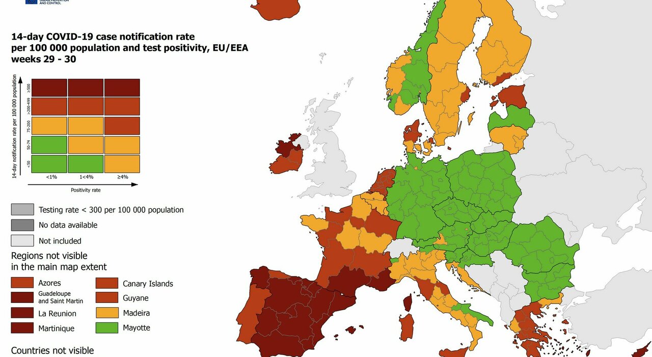 Ormai tutta l’Italia è in giallo nella mappa del contagio in Europa misurata dall’Ecdc (Centro europeo per il controllo e la prevenzione delle malattie) sulla situazione Covid. Salgono a quattro le regioni italiane rosse: oltre alla Sicilia e alla Sardegna, tornate rosse la scorsa settimana, nell’ultimo aggiornamento si aggiungono anche la Toscana e le Marche. Restano verdi soltanto il Molise, la Puglia al Sud e la Valle d’Aosta al Nord.