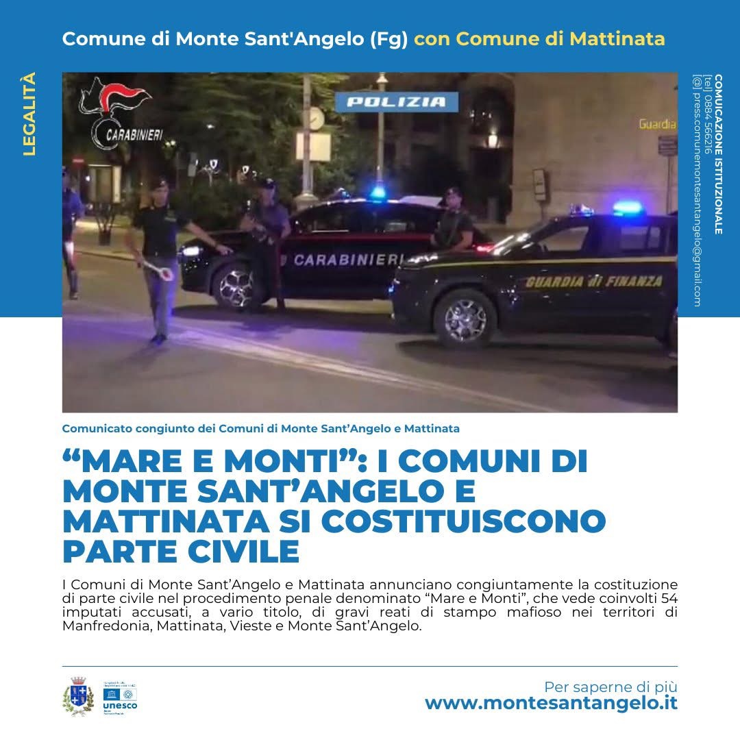 I Comuni di Monte Sant’Angelo e Mattinata annunciano congiuntamente la costituzione di parte civile nel procedimento penale denominato “Mare e Monti”, che vede coinvolti 54 imputati accusati, a vario titolo, di gravi reati di stampo mafioso nei territori di Manfredonia, Mattinata, Vieste e Monte Sant’Angelo.