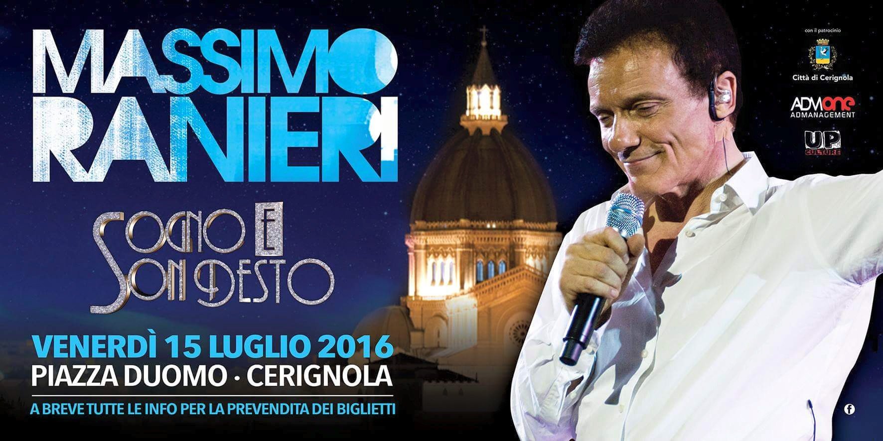 Venerdi 15 Luglio 2016 per la prima volta a Cerignola Piazza Duomo diventa un anfiteatro all’aperto con posti a sedere numerati: ci sarà il grande artista Massimo Ranieri con lo spettacolo “Sogno e son desto”.