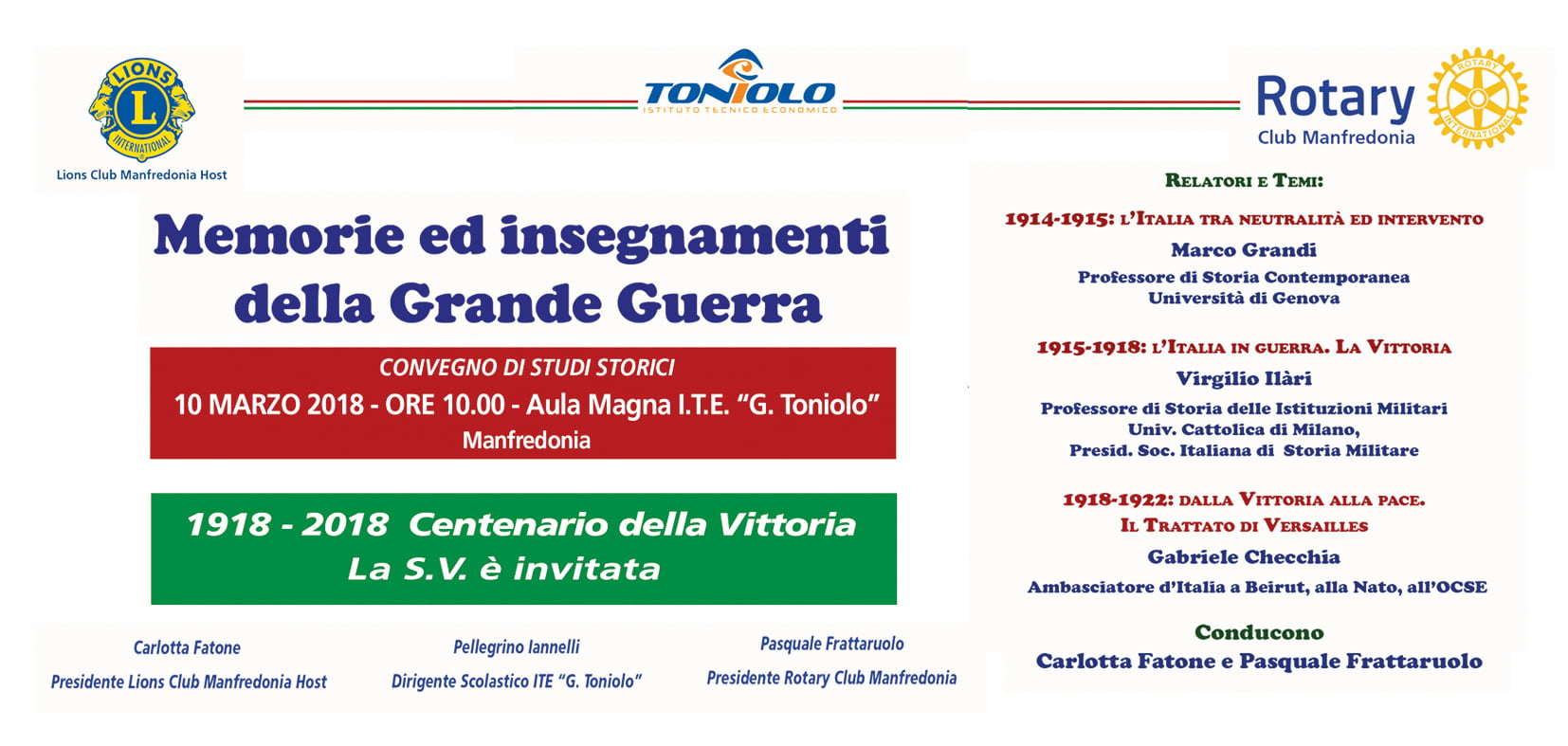 Sabato 10 marzo, alle ore 10.00, presso l’ITE “G. Toniolo” di Manfredonia, organizzato dal Lions Club Manfredonia Host e dal Rotary Club Manfredonia, in collaborazione con l’ITE “G. Toniolo”, avrà luogo il Convegno di Studi Storici, “Memorie ed Insegnamenti della Grande Guerra”, in occasione del centenario dalla conclusione del primo conflitto mondiale. Fortemente voluto dai Club promotori per l’alto valore culturale e formativo, il convegno, rivolto alla cittadinanza, è stato accolto con vivo apprezzamento dall’istituzione scolastica, divenuta target privilegiato dell’evento. Tutti gli istituti superiori, ognuno dei quali sarà rappresentato da una classe quinta o da una selezione di alunni, godranno dell’opportunità di acquisire e sviluppare conoscenze sul fatto storico che ha stravolto gli equilibri del mondo, proiettandolo poi in quelle dinamiche sociali ed economiche responsabili dell’avvento delle dittature. All’analisi dei relatori, Marco Grandi, Professore di Storia Contemporanea presso l’Università di Genova; Virgilio Ilàri, Presidente della Società Italiana di Storia Militare, e Gabriele Checchia, ambasciatore d’Italia a Beirut, alla Nato e all’OCSE, saranno affidati i momenti salienti del conflitto, l’entrata in guerra dell’Italia, la guerra, la vittoria e la pace con i trattati, in un’interattività con il pubblico, mirante a fornire un quadro d’insieme dell’evento quanto più vivo ed esauriente possibile.