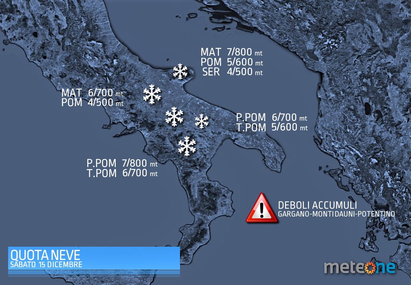Domani l’entrata di aria più fredda riporterà la neve anche in Puglia e Basilicata ma sempre a quote di medio-alta collina. Possibili imbiancate su monti dauni, appennino lucano e Gargano.