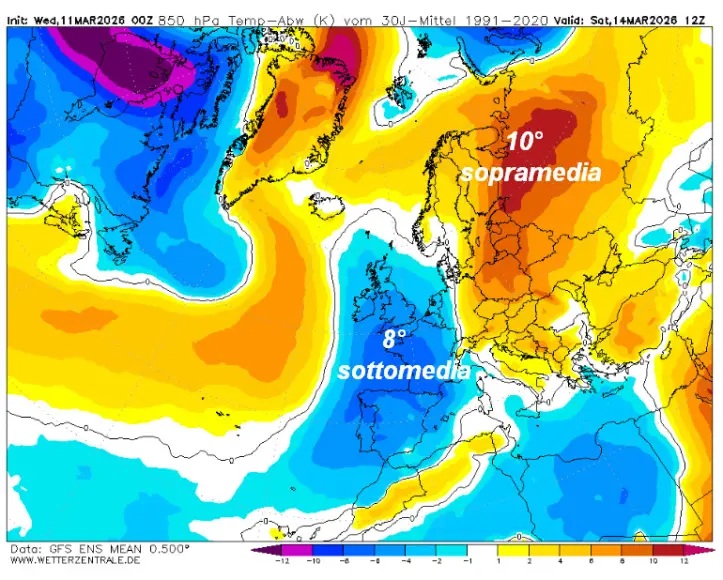 In Italia da sabato dovrebbe intervenire una forte fase di maltempo ad iniziare dal centro-nord, ma le temperature non dovrebbero scendere molto, 2-3° sotto media (al massimo) sul settore di nord-ovest.