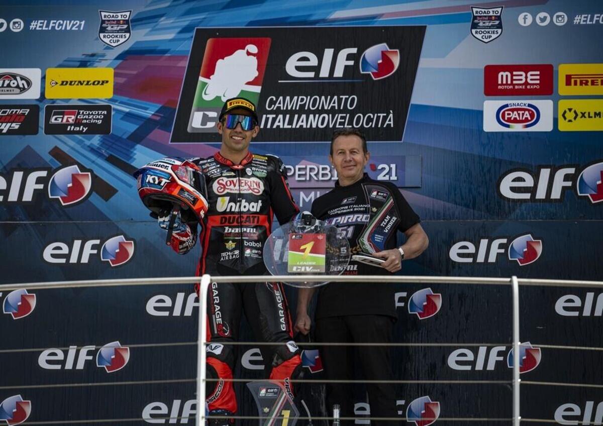 Michele Pirro si è laureato Campione Italiano 2021, dopo una gara dominata dal primo all’ultimo giro. Il pilota del team Barni Racing è scattato subito in testa ed in pochi giri ha accumulato un vantaggio che gli ha poi permesso di tagliare indisturbato il traguardo. Una vittoria che non sarebbe bastata ad assicurargli il suo ottavo titolo italiano senza un problema tecnico occorso a Lorenzo Zanetti. Il bresciano che in campionato era secondo a 64 punti dal collaudatore della Ducati, dopo pochi giri ha dovuto rientrare al suo box per risolvere un problema alla sua V4. Rientrato in gara ha poi concluso all’undicesimo posto, raccogliendo comunque 5 punti.