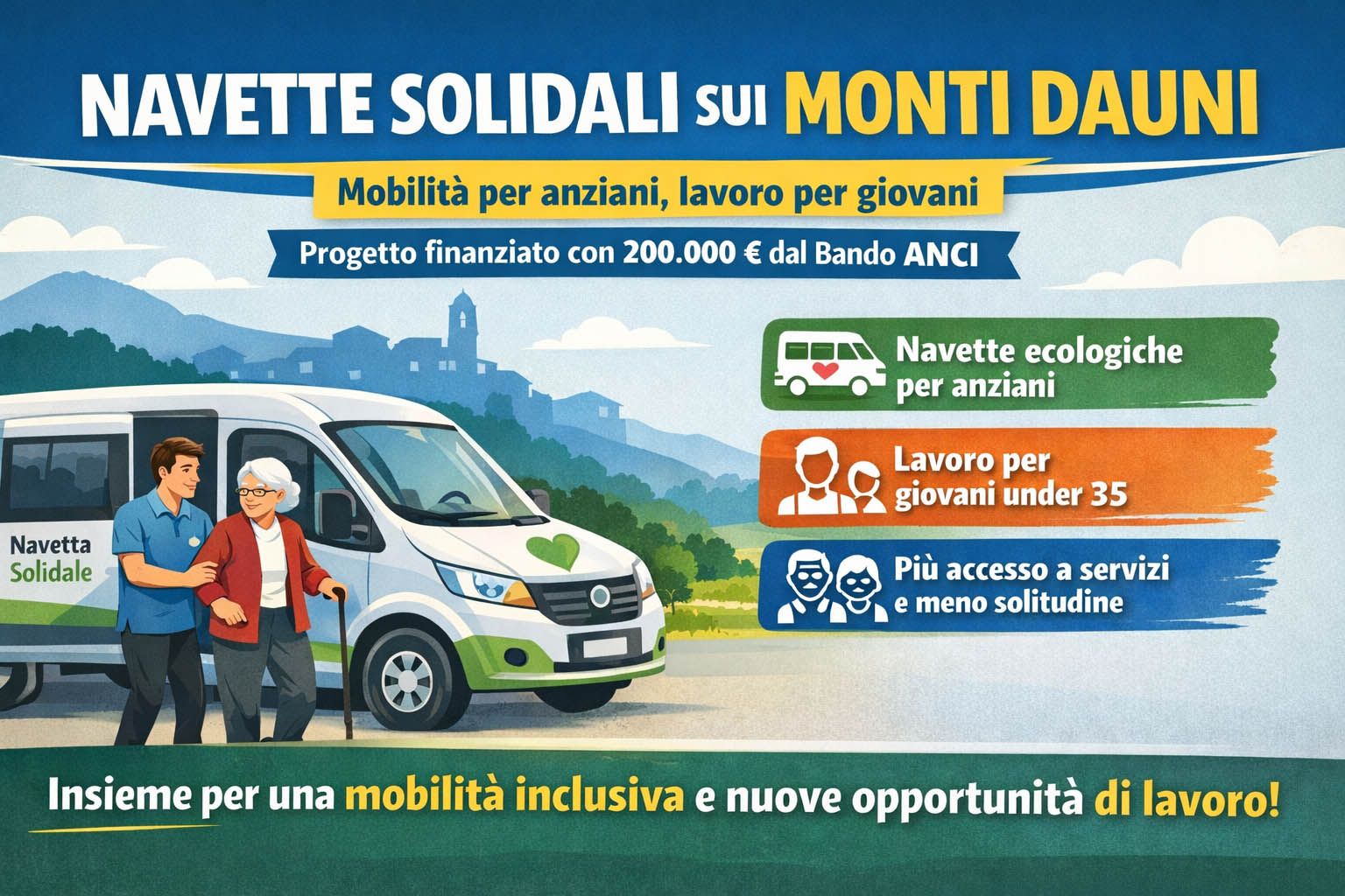 In molti piccoli centri, infatti, gli anziani affrontano quotidianamente difficoltà negli spostamenti, spesso legate alla distanza dai servizi essenziali e alla mancanza di alternative di trasporto. Allo stesso tempo, tanti giovani faticano a trovare occupazione stabile. “Navette solidali” prova a dare una risposta concreta a entrambe queste esigenze, trasformando una criticità in opportunità.