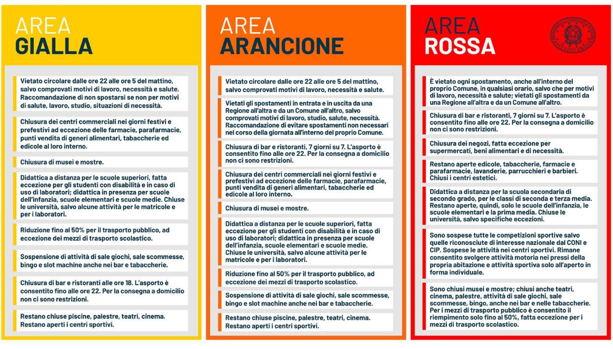 Sono tre le Regioni che dovrebbero passare dal giallo all’arancione in base ai dati del monitoraggio settimanale che sara’ presentato oggi. Secondo quanto si apprende, sono il Molise, la Campania e l’Emilia Romagna. La provincia Autonoma di Bolzano e l’Umbria dovrebbero passare al rosso anche se in parte già lo erano con ordinanze regionali. La decisone sarà presa dal ministro Speranza nelle prossime ore alla luce delle ultime valutazioni della cabina di regia e del Comitato tecnico scientifico.