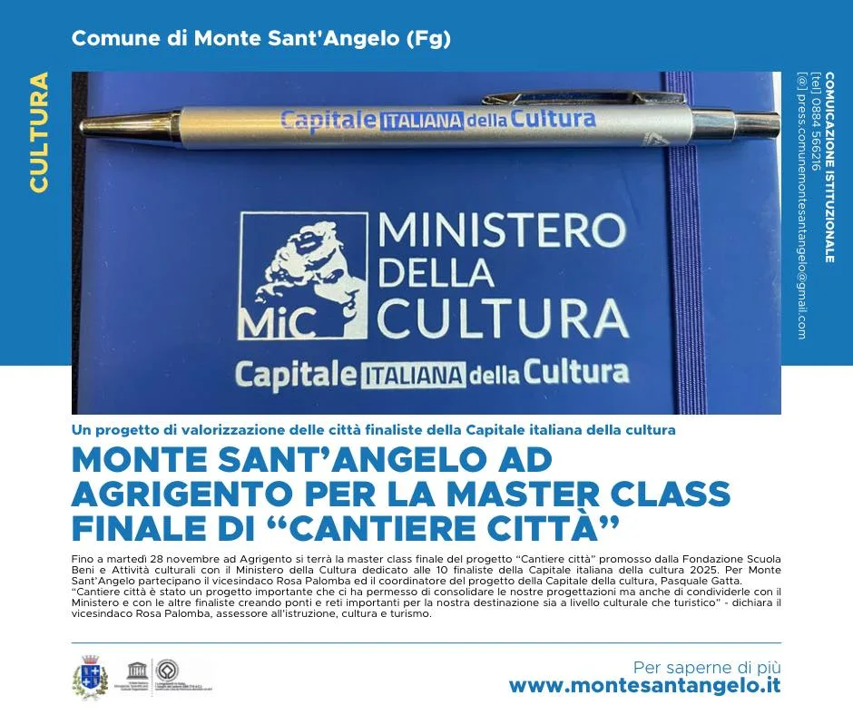 Fino a martedì 28 novembre ad Agrigento si terrà la master class finale del progetto “Cantiere città” promosso dalla Fondazione Scuola dei beni e delle attività culturali con il Ministero della Cultura dedicato alle 10 finaliste della Capitale italiana della cultura 2025. Per Monte Sant’Angelo partecipano il vicesindaco Rosa Palomba ed il coordinatore del progetto della Capitale della cultura, Pasquale Gatta.
