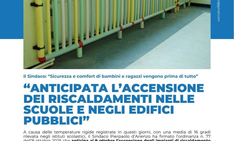 🔴 L’ANNUNCIO DEL SINDACO: “ANTICIPATA L’ACCENSIONE DEI RISCALDAMENTI NELLE SCUOLE E NEGLI EDIFICI PUBBLICI”