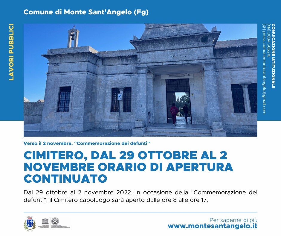 Dal 29 ottobre al 2 novembre 2022, in occasione della “Commemorazione dei defunti”, il Cimitero capoluogo sarà aperto dalle ore 8 alle ore 17.