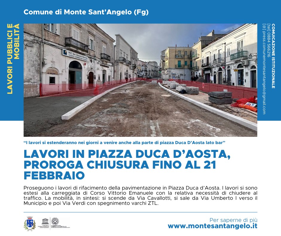 Monte Sant’Angelo, proroga chiusura per lavori in Piazza Duca D’Aosta