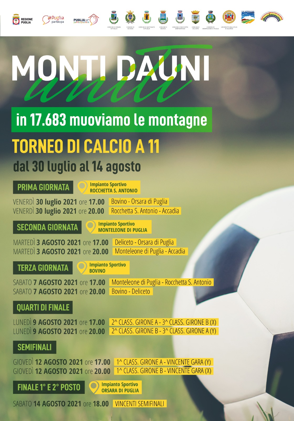 Si chiama “Monti Dauni Uniti, in 17.683 muoviamo le montagne” ed è il primo torneo di calcio a 11 che mette insieme gli 8 paesi dell’Unione dei Comun dei Monti Dauni: Orsara di Puglia, Accadia, Bovino, Deliceto, Monteleone di Puglia, Panni, Rocchetta Sant’Antonio e Sant’Agata di Puglia.