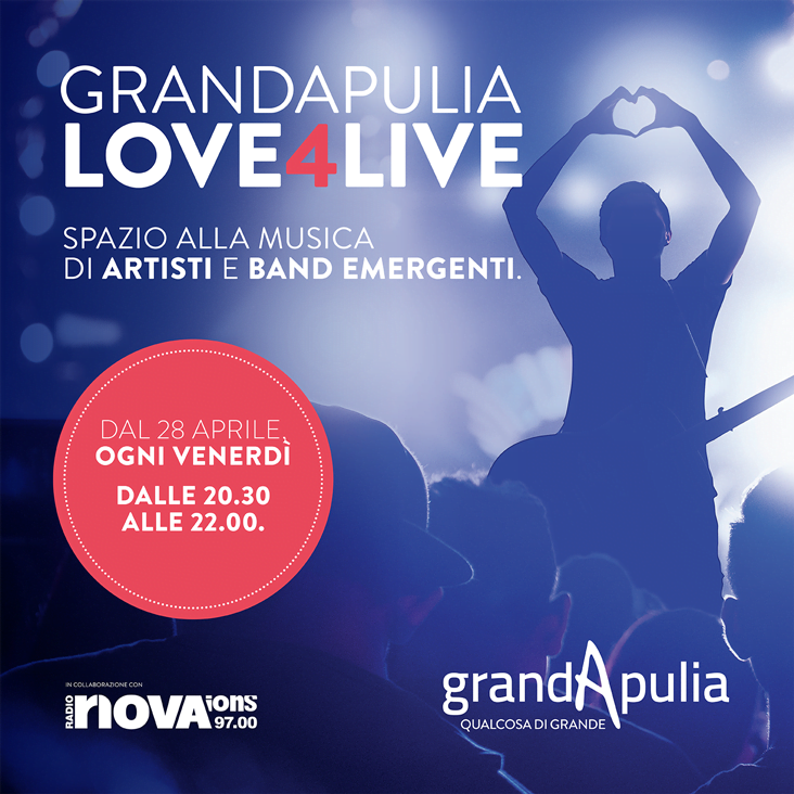 Nell’era dei talent show, dove bravura e talento di un artista sono ingabbiati in una griglia di esibizioni ad orologeria di fronte a un pubblico chiamato a dare un giudizio immediato e spesso sommario, il GrandApuliavuole dar voce alla musica intesa come libera espressioneemomento di puro divertimento. Ecco perché ha deciso di lanciare#LOVE4LIVE,un nuovo format con il quale si mette a disposizione il palco dell’area eventi live a cantautori e band emergenti che vorranno presentare al pubblico i loro brani originali, che saranno trasmessi non solo in filodiffusione in tutto il Centro Commerciale, ma anche in radio, grazie ad una collaborazione che il GrandApulia ha avviato con Radionovaions97 FM.