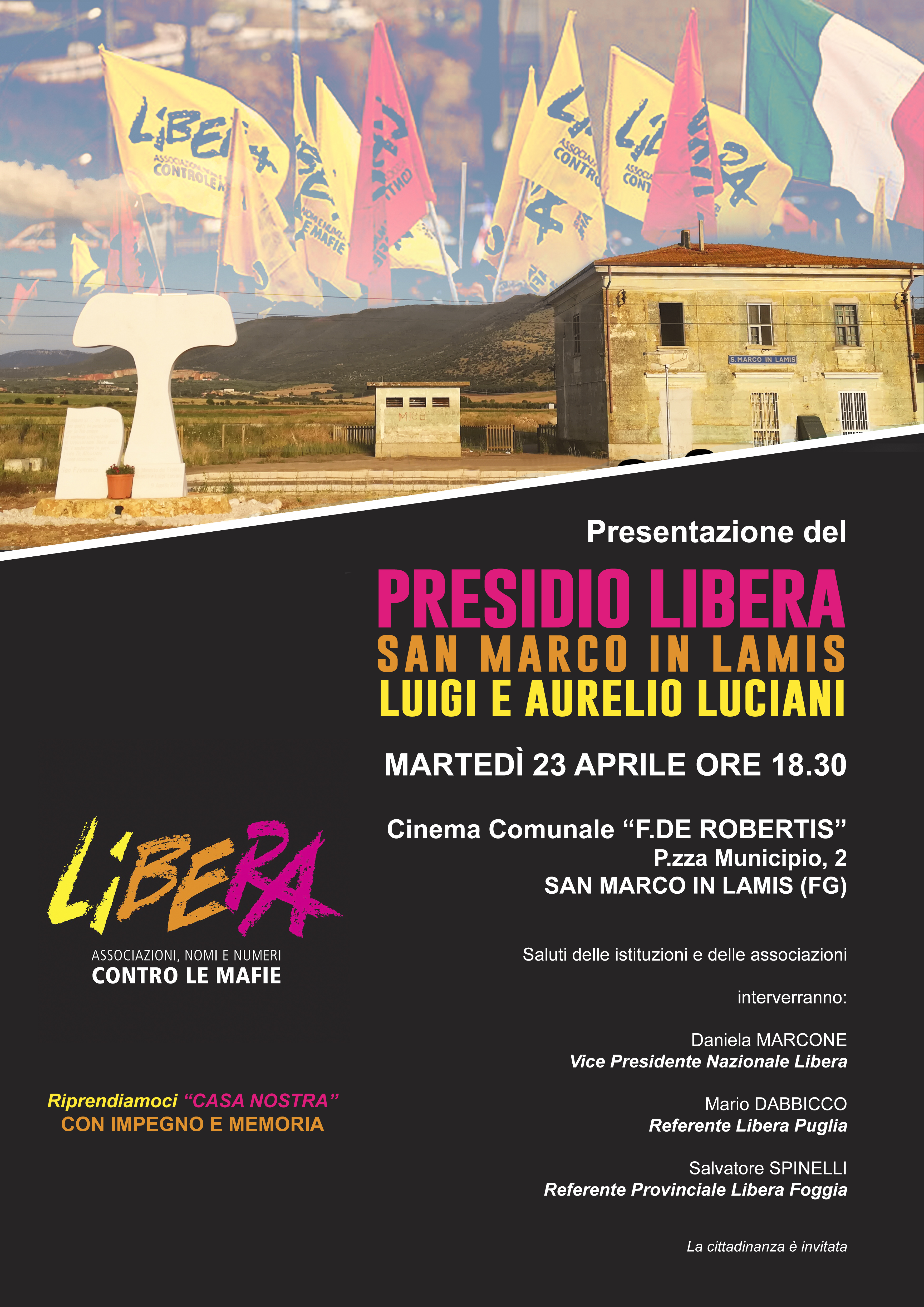 Martedì 23 aprile, alle ore 18.30, presso il Cinema Comunale “F. De Robertis” di San Marco in Lamis, si terrà l’assemblea di costituzione del Presidio Cittadino di Libera.