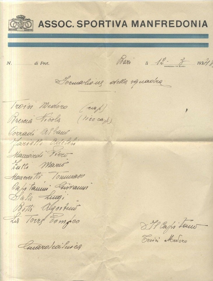 Una lettera datata 12 marzo 1934, ingiallita dal tempo, ma ancora vibrante di ricordi, con la formazione del Manfredonia Calcio, all’epoca Associazione Sportiva Manfredonia, firmata dall’allora capitano Medoro Troisi.