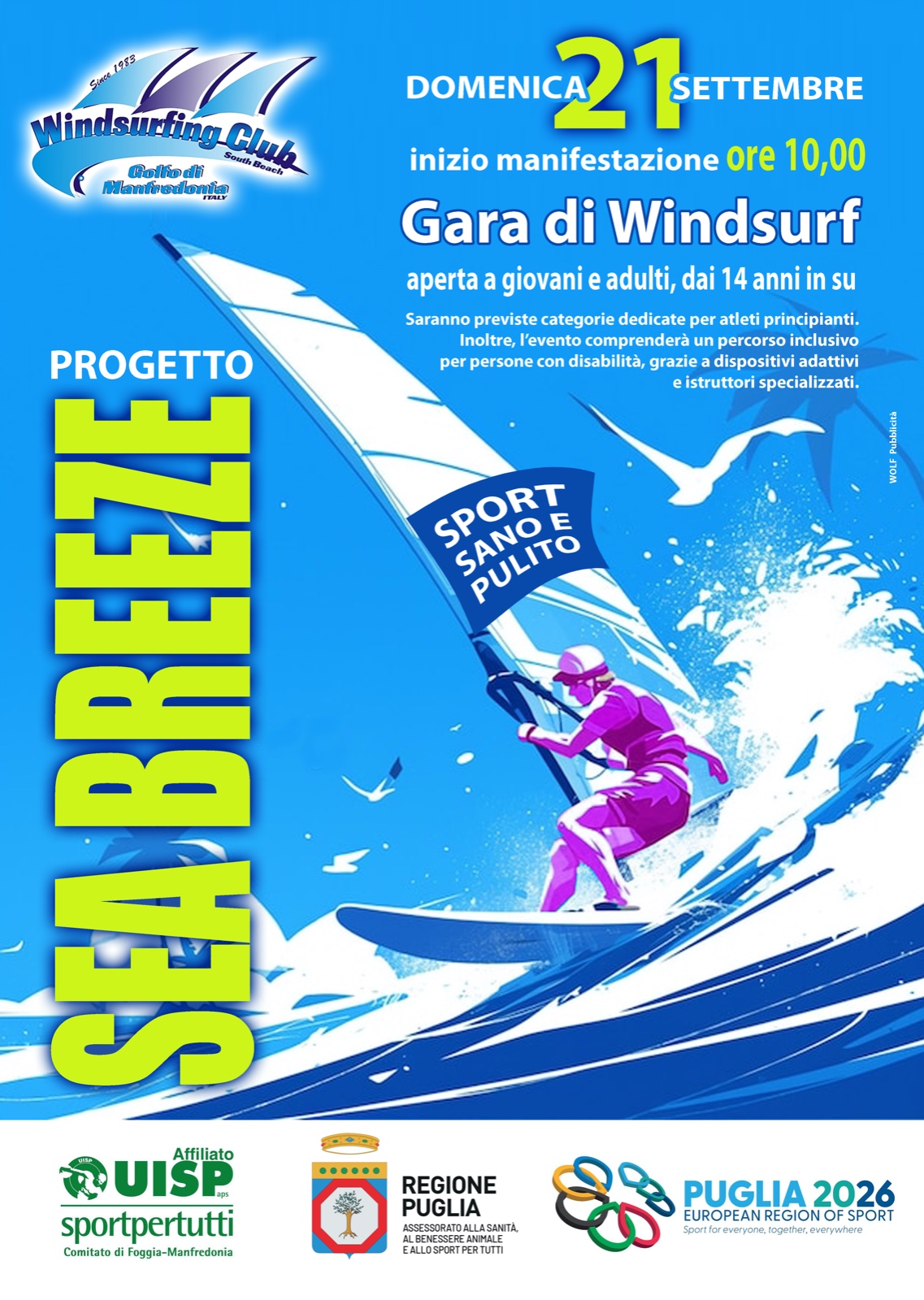 Il mare del Gargano si prepara ad accogliere Sea Breeze, una manifestazione dedicata al windsurf in programma domenica 21 settembre 2025 nel Golfo di Manfredonia, nello specchio acqueo di Siponto.