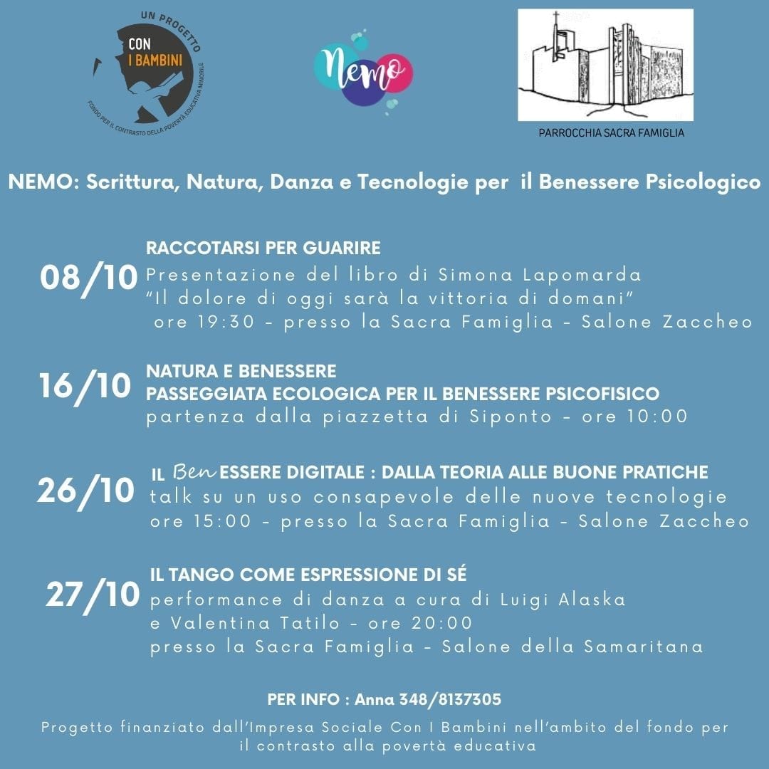 Passeggiare in natura, ballare un tango, scrivere un libro e usare nella maniera appropriata le nuove tecnologie, sono attività che possono favorire il benessere emotivo e psicologico. Un tema di grande attualità su cui NEMO, progetto selezionato dall’Impresa Sociale Con i Bambini nell’ambito del Fondo per il contrasto della povertà educativa minorile, ha voluto accendere i riflettori, organizzando a Manfredoniaquattro appuntamenti che celebrano il mese del Benessere Psicologico.