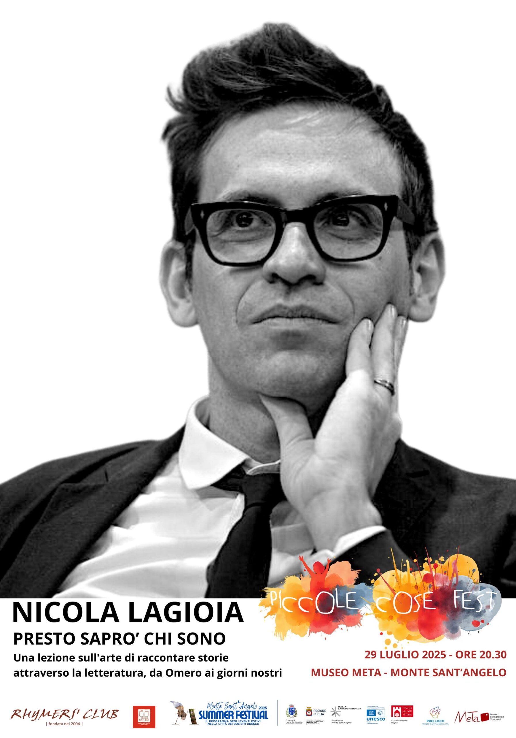 Il 29 luglio alle ore 21.00 sulla terrazza del MeTA – Museo Etnografico Tancredi – a Monte Sant’Angelo, Nicola Lagioia inaugura le serate della X edizione del Piccole Cose Fest con “Presto saprò chi sono”, una lezione‑spettacolo intensa e coinvolgente sull’arte del raccontare. Scrittore, saggista, già direttore del Salone Internazionale del Libro di Torino e vincitore del Premio Strega con La ferocia, Lagioia è una delle voci più lucide e originali della narrativa italiana contemporanea. In questo appuntamento, al tempo stesso lectio e narrazione teatrale, accompagna il pubblico in un viaggio attraverso i grandi archetipi della letteratura, da Omero ai giorni nostri, rivelando come le storie – e la loro capacità di metterci in contatto con ciò che ci rende umani – siano ancora oggi strumenti di salvezza e conoscenza. Raccontare, per Lagioia, non è un esercizio estetico ma una necessità esistenziale, un modo per avvicinarsi a sé stessi, per toccare la vertigine del “chi siamo”, per educare lo sguardo e risvegliare la coscienza. “Presto saprò chi sono” non è soltanto il titolo di una lezione, è una promessa che attraversa il tempo e l’esperienza letteraria, nella convinzione che leggere ci renda più veri, più vulnerabili, più vivi. L’ingresso è libero fino a esaurimento posti.