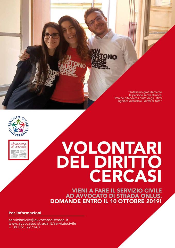 Per il quarto anno consecutivo, anche lo sportello foggiano di Avvocato di Strada è stato individuato tra le sedi nazionali che ospiteranno un operatore volontario/ia nell’ambito del Servizio Civile Nazionale. Sul sito www.serviziocivile.gov.it, infatti, è stato pubblicato il bando servizio civile 2019 per la selezione di Operatori volontari che possono candidarsi per il progetto “Non esistono cause perse” promosso da Avvocato di Strada, l’associazione che fornisce assistenza legale gratuita ai senza fissa dimora che non possono usufruire del gratuito patrocinio a spese dello Stato. Anche quest’anno, dunque, tra le sedi per le quali è possibile presentare domanda c’è quella di Foggia, ospitata presso l’Help Center della stazione ferroviaria.