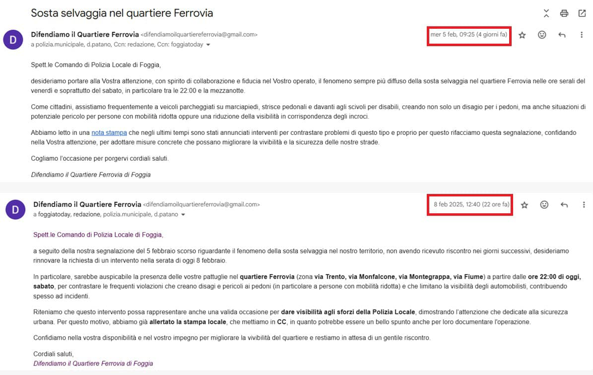 Chiediamo rispetto per i cittadini onesti che vogliono vivibilità e sicurezza. Chiediamo quantomeno una risposta educata alle nostre richieste formali, considerato che siamo cittadini foggiani che pagano le tasse comunali e che quindi finanziano gli stipendi pubblici.