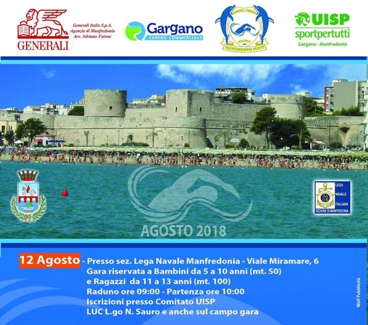 Domenica 12 Agosto inizia la tre giorni di nuoto organizzata dall’ASD Manfredonia running & friends e Comitato Uisp di Manfredonia. Si inizia con la 1^ Nuotata dei Piccoli Delfini, il raduno avverà  presso la Lega Navale  alle ore 09.00, la partenza delle prime batterie è prevista alle 10.00.