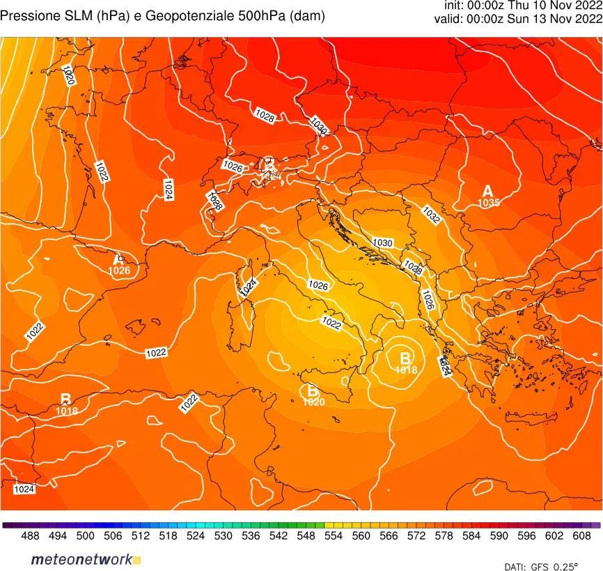 Piogge estese, di natura autunnale, con il minimo (B) piazzato sul golfo di Taranto. Sarà l’incertezza del suo spostamento a caretterizzare l’intensità delle piogge e le zone maggiormente interessate, con il classico rischio che buona parte dei fenomeni finiscano in mare a causa della natura ciclonica della perturbazione.