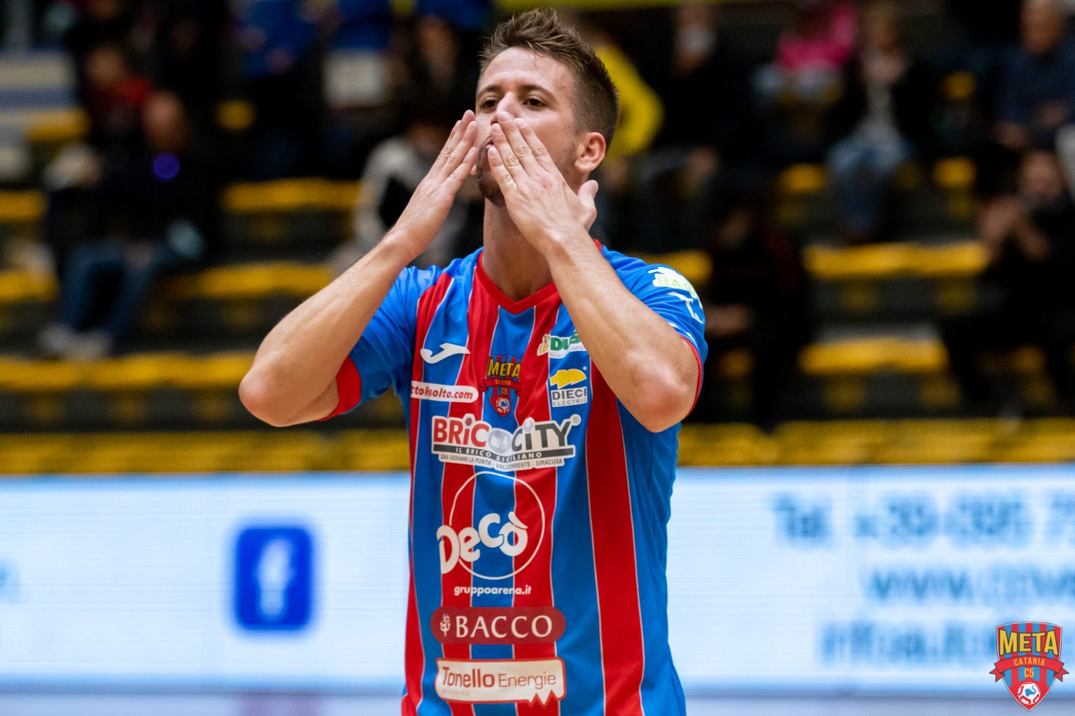 La ripresa si apre con Duvara che con l’aiuto di Musumeci sventa un insidioso tiro di Canabarro ma passano solo 1’45” che la Meta Catania triplica. Musumeci approfitta di un errato disimpegno degli ospiti, suggerisce per Campoy che nel cuore dell’area realizza la sua personale doppietta. Dovara è ancora protagonista con una super parata a mano aperta su Canabarro. Al 4’ Silvestri trova il poker per i padroni di casa ribadendo in rete una carambola sulla linea di porta. I rossoazzurri dilagano con Tusar al 6’40”, bravo a spingere in porta un facile tap in, su assist di uno scatenato Musumeci. Well al 8’ sorprende Dovara e accorcia le distanze per i garganici. Messina in contropiede, lanciato dal suo portiere, non sbaglia davanti a Lupinella al 10’30”. Il Vitulano Drugstore C5 Manfredonia, oramai disunito, concede una nuova ripartenza a Messina ma il tentativo finisce sull’esterno della rete. Galan rimedia il secondo giallo e va anzitempo negli spogliatoi a 8’55” dalla sirena. I biancoceleste, per la prima volta in stagione, sfruttano la superiorità numerica e vanno ancora in gol con Well che mette dentro su perfetto assist di Caruso al 12’30”. Numero di Boutabouzi che trova attento Dovara. Monsignori prova il portiere di movimento. Well si divora il terzo gol, tutto solo davanti alla porta. Musumeci suggella la sua splendida serata trasformando un tiro libero. Persec mette dentro la terza rete, su assist di Cutrignelli, poi Tusar fissa il finale sul punteggio di 8-3, siglando una nuova marcatura su nuovo tiro libero. Una debacle che relega i biancoceleste sul fondo della classifica e di certo non aiuta a ritrovare morale e punti salvezza. Prossimo turno con il Vitulano Drugstore C5 Manfredonia impegnato nuovamente in trasferta sul terreno della Feldi Eboli.