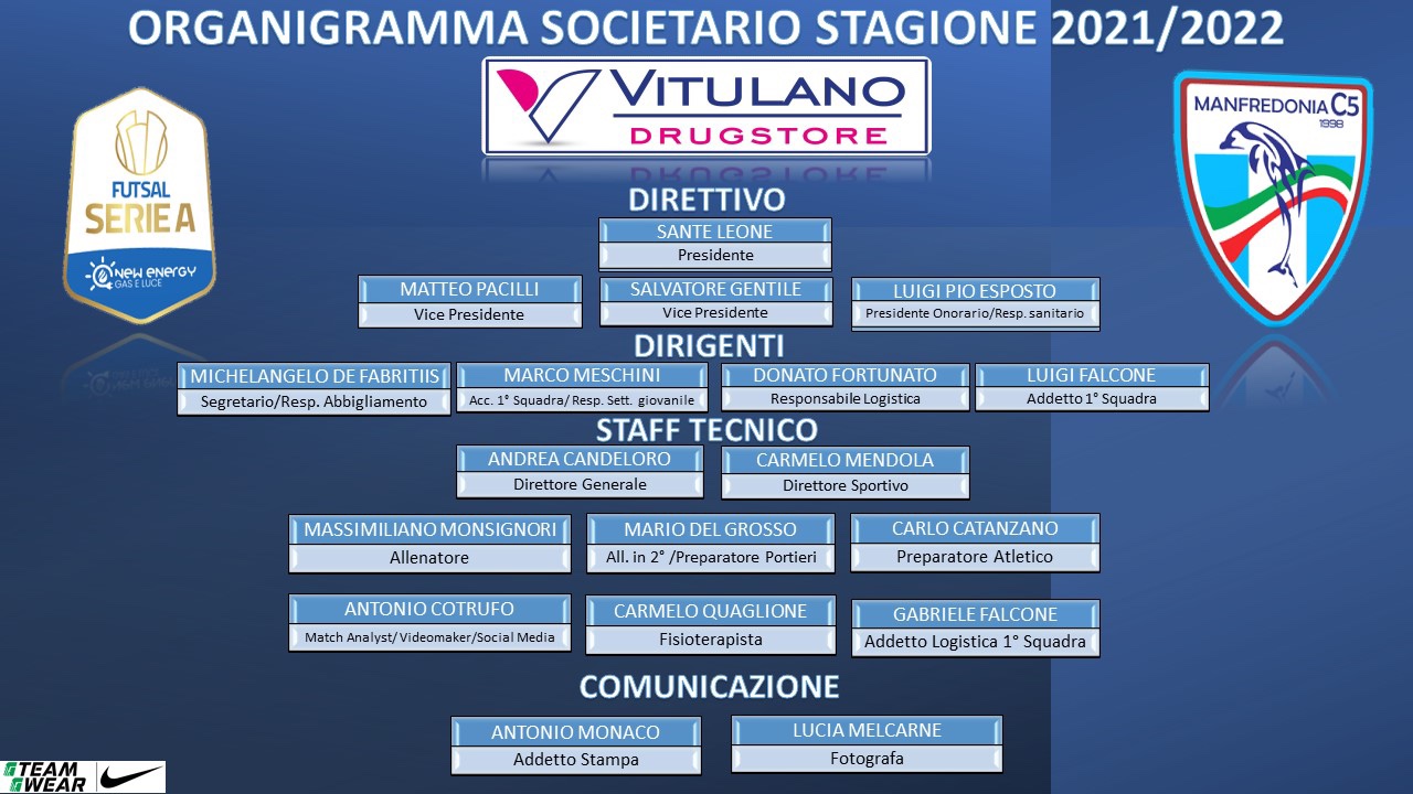 La società Vitulano Drugstore C5 Manfredonia continua incessantemente il lavoro di preparazione ed organizzazione in vista del primo impegnativo campionato nazionale di serie A e comunica di aver definito l’organigramma societario per la stagione sportiva 2021/2022.