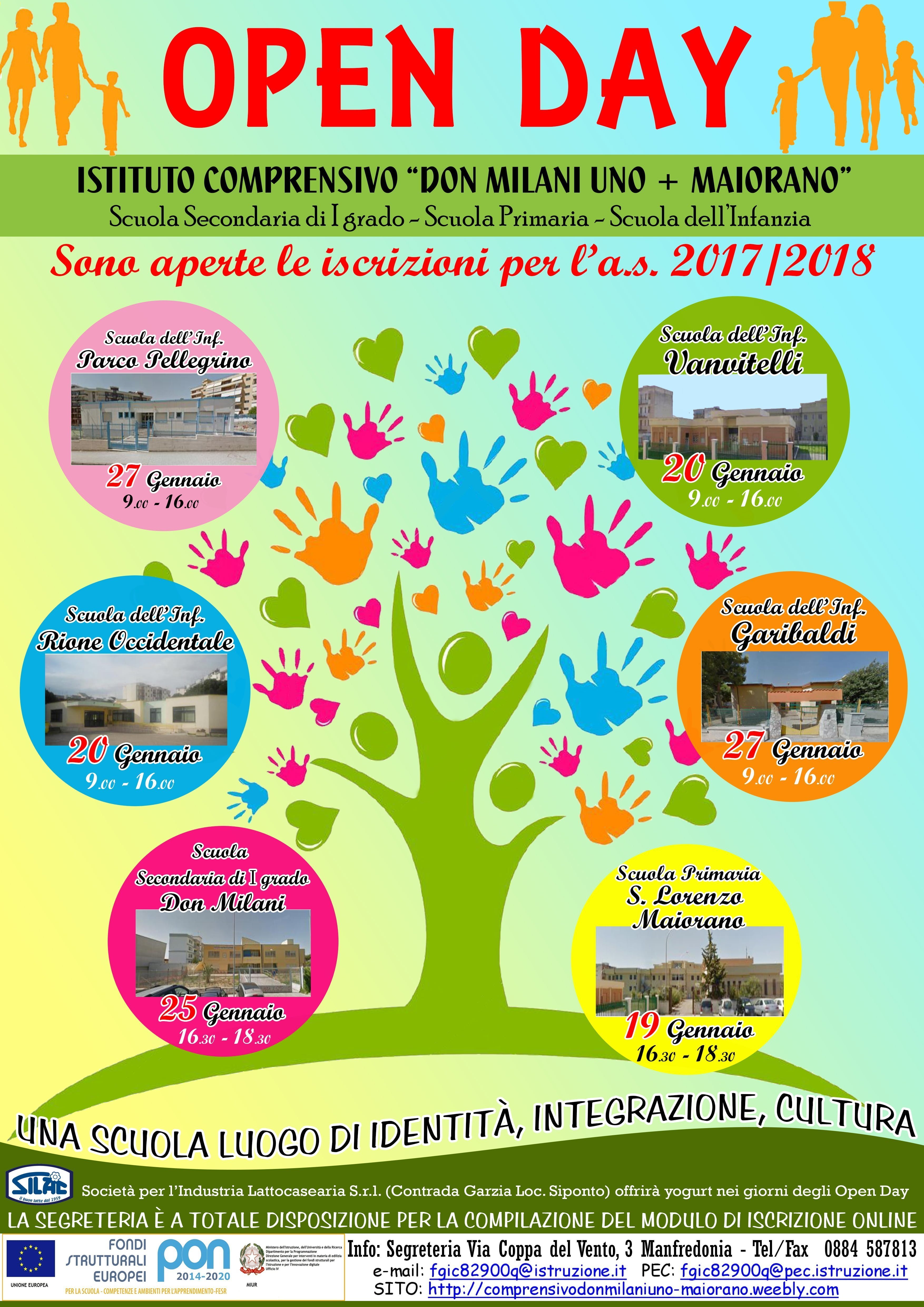 Anche quest’anno l’Istituto comprensivo “Don Milani uno + Maiorano” ha organizzato quattro giornate dedicate agli Open Day per incontrare le famiglie e gli alunni che potranno conoscere l’Offerta Formativa del nostro Istituto, i docenti, le finalità dei progetti didattici curriculari ed extracurriculari nonché gli spazi, i laboratori e le attività didattiche. In questa occasione le famiglie e gli alunni saranno coinvolti in molteplici attività didattiche, formative e ludicoricreative. Le date dei nostri Open Day sono le seguenti: