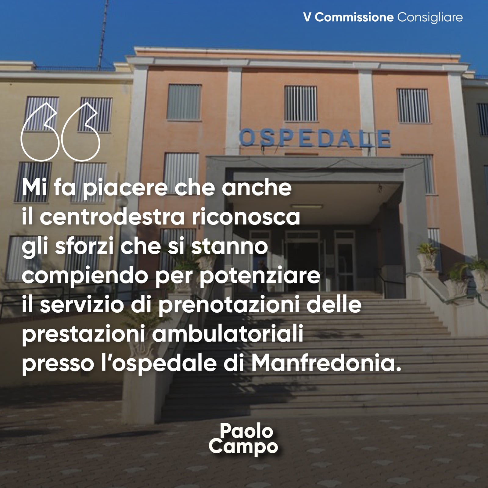 Paolo Campo: “Mi fa piacere che anche il centrodestra riconosca gli sforzi che si stanno compiendo per potenziare il servizio di prenotazioni delle prestazioni ambulatoriali presso l’ospedale di Manfredonia”