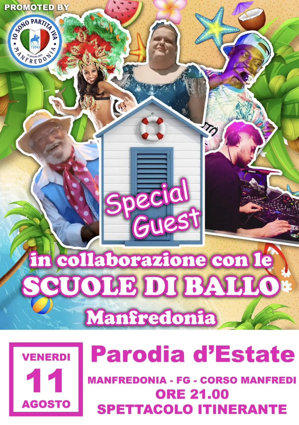 VENERDÌ 11 AGOSTO - PARODIA D’ESTATE Siete tutti invitati alla PARATA ITINERANTE, dalle ore 21:00, per cantare e ballare insieme alla scuole di ballo nel centro storico di Manfredonia. Special Guest: Nozzolino DJ Caiaffa Voice Julio Cesar Brasil Ze Peppè