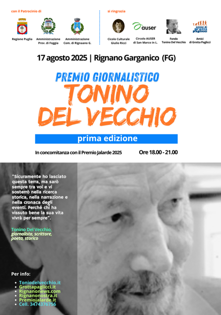 È ufficialmente partita l’organizzazione della Prima Edizione del Premio Giornalistico “Tonino Del Vecchio” (Centro Polivalente Ex-Palestra Comunale, Rignano Garganico, 17 agosto 2025, ore 18.00), che intende celebrare la memoria e l’opera del giornalista, storico e scrittore Antonio “Tonino” Del Vecchio, nato e vissuto a Rignano Garganico, il più piccolo Comune del Parco Nazionale del Gargano.