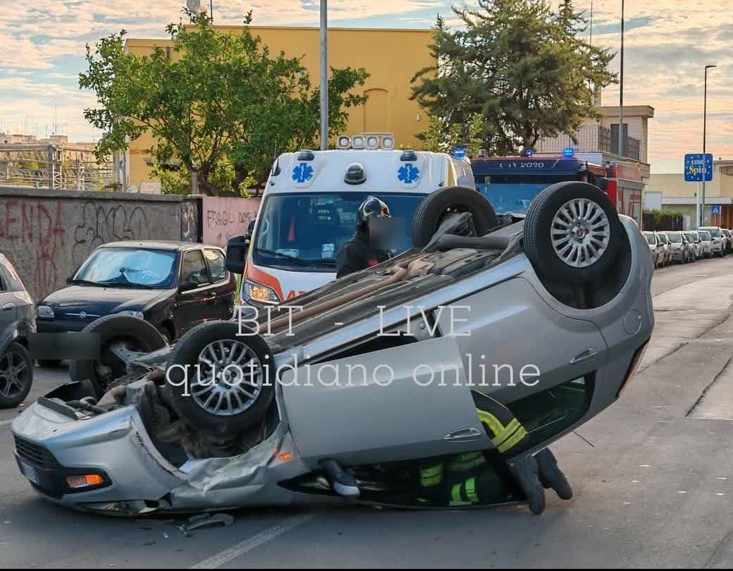 Paura a Bari, auto si ribalta in pieno centro: soccorsa la donna alla guida
