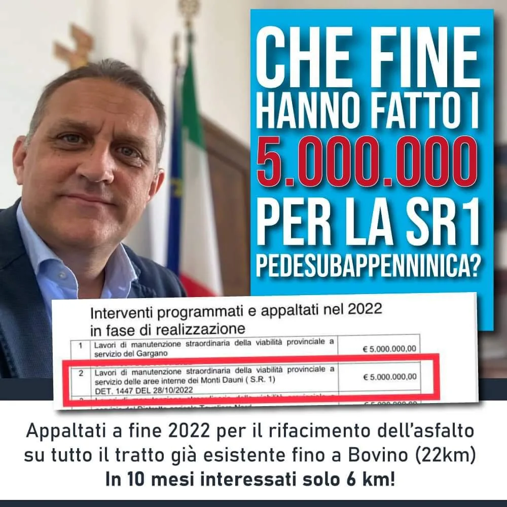 Sto percorrendo la Pedesubappenninica di ritorno da Bovino verso Deliceto ed è tutto un dover stare attenti alle buche. Eppure a dicembre 2022 furono stanziati e appaltati 5 milioni di euro per il rifacimento dell’asfalto su tutto il tratto già esistente della R1, da Candela a Bovino.