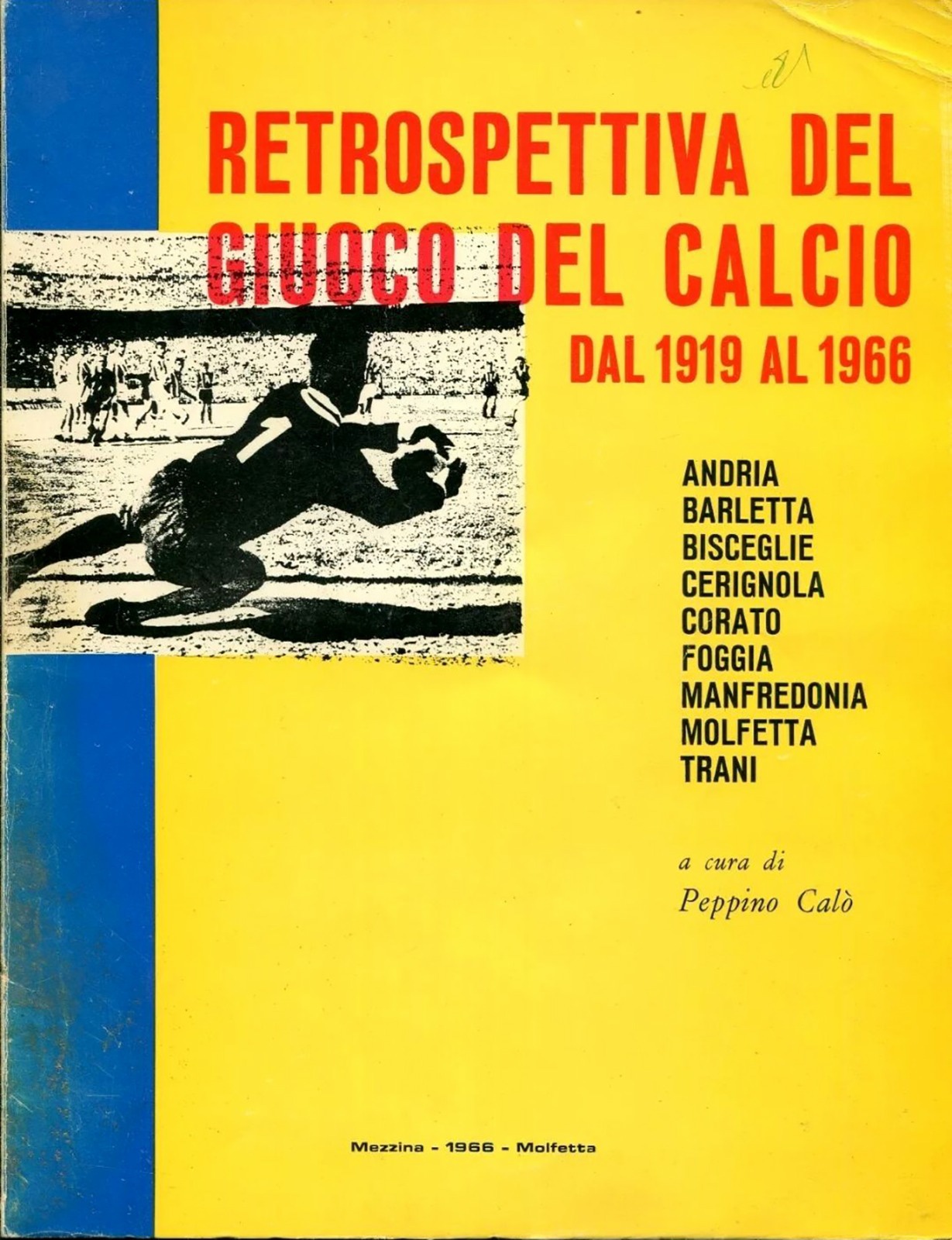 Peppino Calò non era nuovo a questo tipo di iniziative, aveva scritto per i biancorossi, chiamati Sparlotti, nel «Il giuoco del Calcio a Molfetta dal 1925 al 1955», Tip. Mezzina, Molfetta, 1965. Poi si era cimentato in «Cinquant’anni di Football a Bari, Taranto e Lecce, 1917-1967», Tip. Mezzina, Molfetta, 1967. Proprio da queste pagine auspicava che i lettori “non daranno importanza alla precisione storica, ma agli episodi e, soprattutto, alle foto che tanta struggente nostalgia evocano, come quelle qui pubblicate dei campi di Bisceglie, Trani, Manfredonia. Quanto ai giovani, spero mi saranno grati per questi appunti «storici» sui loro sodalizi sportivi”.