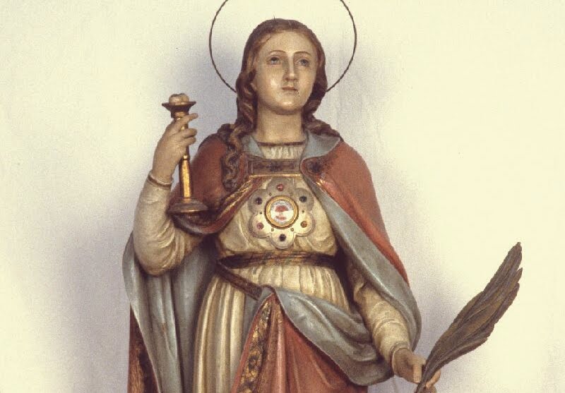 La mamma – intorno alle otto – una volta riempito di profumo le stanze, spegneva le fiamme della cucina e lasciava riposare le fave nell’acqua ancora bollente. Dunque si recava nella chiesa di San Francesco dove la statua della Santa era esposta in devozione; in ogni ora della giornata si diceva la messa fino a sera, mentre nella chiesa di San Benedetto si ospitavano i fedeli della santa esposta ai devoti.