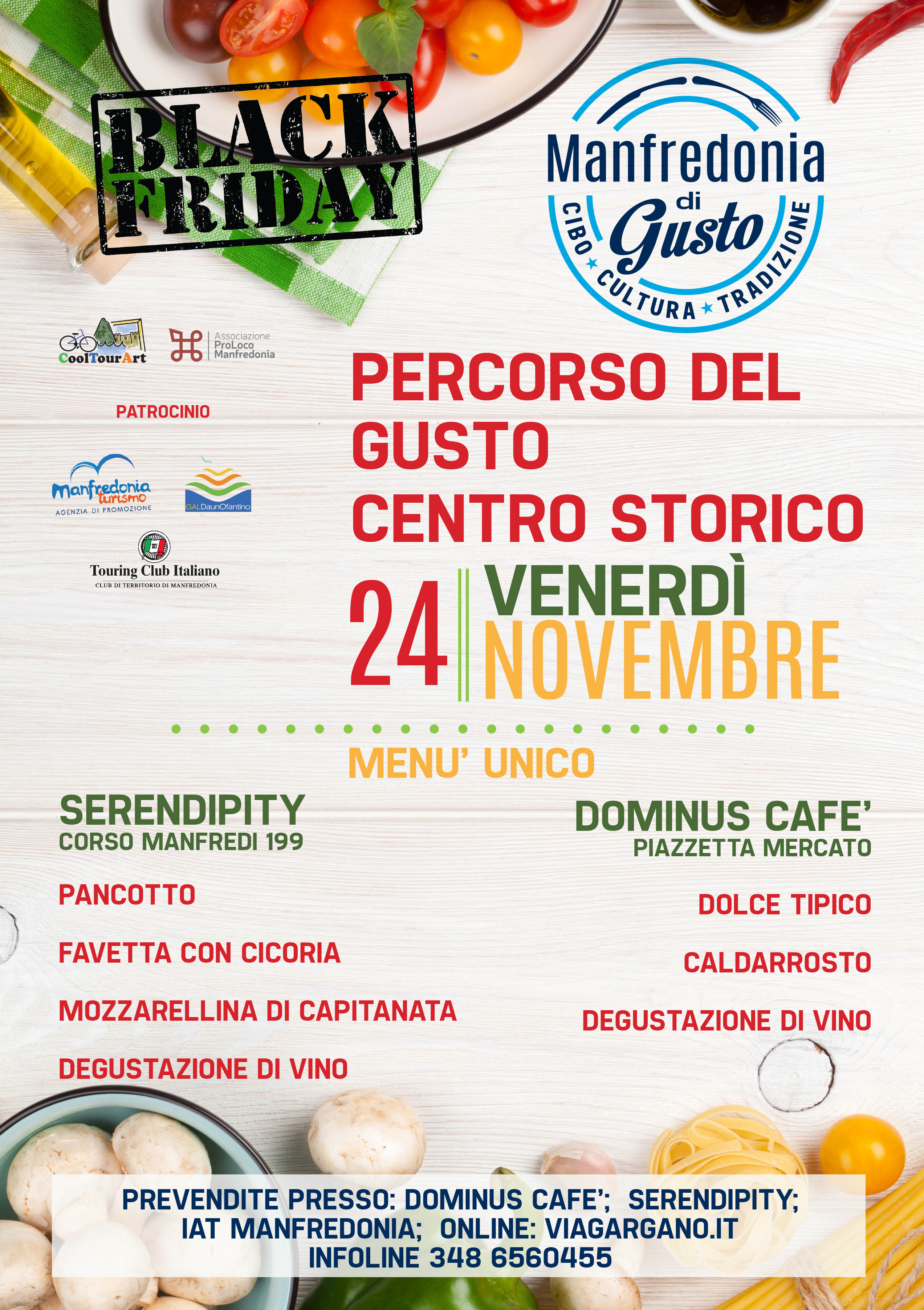 Venerdì 24 novembre il “Percorso del gusto nel centro storico” diventa “Black Friday”. Infatti, in occasione dell’ultimo percorso di degustazioni, dell’iniziativa organizzata dalla CoolTourArt in collaborazione con Proloco di Manfredoniaed il patrocinio di Agenzia del turismo, GalDaunOfantino e Touring club di Manfredonia, Manfredonia di Gusto, si allinea al “Black Friday” con un’offerta speciale. Infatti, in un’ottica di promozione dell’iniziativa Manfredonia di Gusto, il percorso previsto fra Corso Manfredi e Piazzetta Mercatoha un costo promozionale di € 5,00 invece che € 12,00. Il ticket comprende una degustazione di piatti tipici della tradizione del territorio, come “Pancotto tradizionale”, “Favetta e cicoria”, “mozzarellina di Capitanata”, in Corso Manfredi, comodamente seduti in una “saletta” messa a disposizione dalla “Caffetteria Serendipidy”, all’interno di uno dei cortili storici più belli della città, per poi proseguire in Piazzetta Mercato con“Castagne del Gargano” e “Cartellata al vino cotto” in uno dei tanti spazi a disposizione dalla piazzetta. Inoltre, in entrambe le “location” è compresa una degustazione di vini di rinomate Cantine, orgoglio della provincia di Foggia, in abbinamento alle pietanze servite. La CoolTourArt, per questo appuntamento, ha invitato pubblicamente gli artisti di strada ad intervenire all’evento utilizzando i vari spazi del centro storico, così dando il “via” ad un altro progetto che l’associazione sta portando avanti da tempo in collaborazione con la Fnas(Associazione Nazionale Arte di Strada), lo sviluppo dell’arte di strada nella città di Manfredonia, come forma d’arte ed espressione culturale. Fra i partecipanti, l’artista ritenuto più idoneo per la location, verrà invitato ad esibirsi nell’ “arena” di Piazzetta Mercato, dove gli ospiti dell’evento, potranno “gustare” ed apprezzare al meglio lo spettacolo. Tante le novità in quest’ultimo appuntamento del “Percorso del gusto nel centro storico” che ritornerà nell’edizione 2018. Manfredonia di Gusto, però continua ancora qualche giorno. Infatti, sabato 25, le associazioni promotrici, grazie al patrocinio dell’Agenzia del Turismo, hanno organizzato dellevisite guidate gratuite nel centro storico della città di Manfredonia, con una piccola degustazione di prodotti tipici al termine. L’edizione 2017 di Manfredonia di Gusto termina domenica 26 novembre con l’”Esperienza in fattoria”, una giornata carica di esperienze alla riscoperta del nostro territorio, vivendo e assaporando le “cose genuine” di una volta. Con ques’utima esperienza Manfredonia di Gusto dà appuntamento a novembre 2018, con i “Weekend da gustare”.