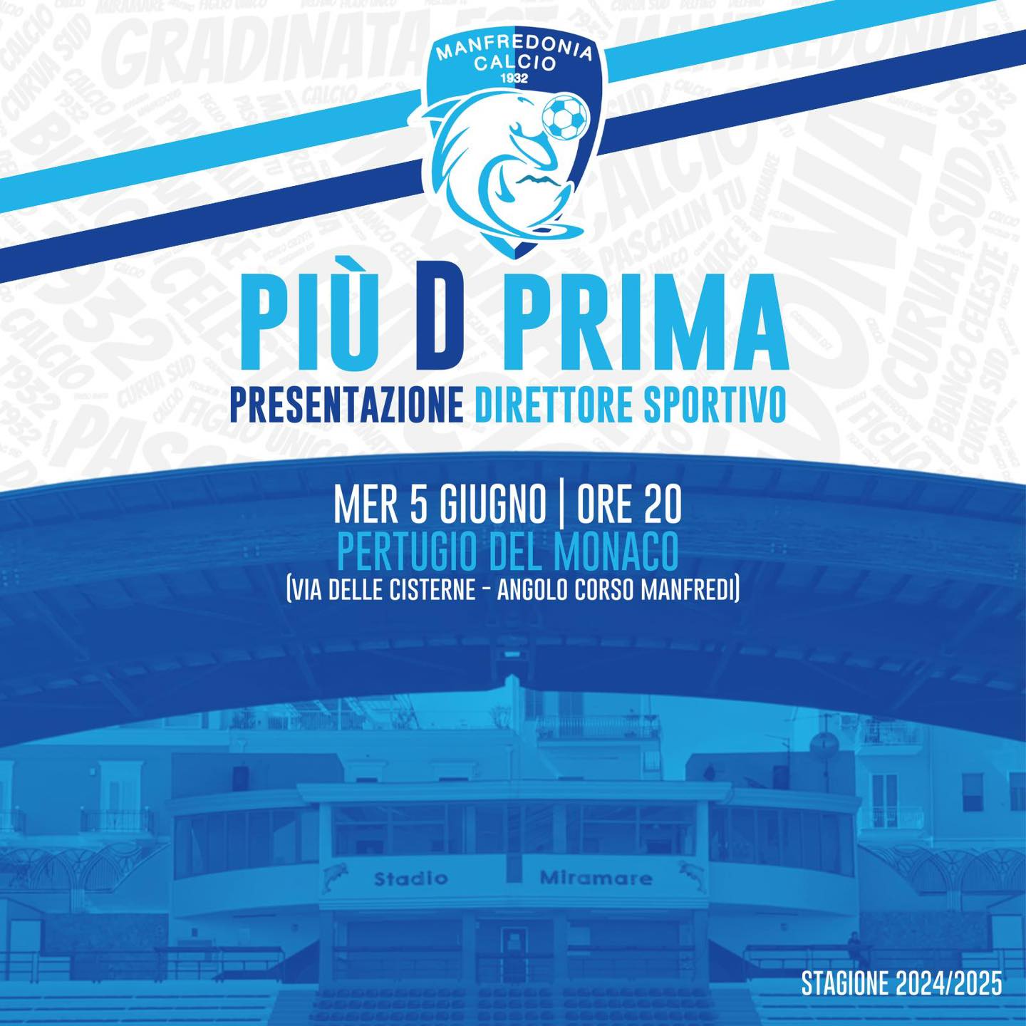 Parte mercoledì, 5 giugno, la stagione 2024/25 del Manfredonia Calcio con la presentazione del Ds Livio Scuotto alle ore 20 presso il Pertugio del Monaco (Via delle Cisterne – angolo Corso Manfredi) -spazio antistante “Cafè des Artistes”.