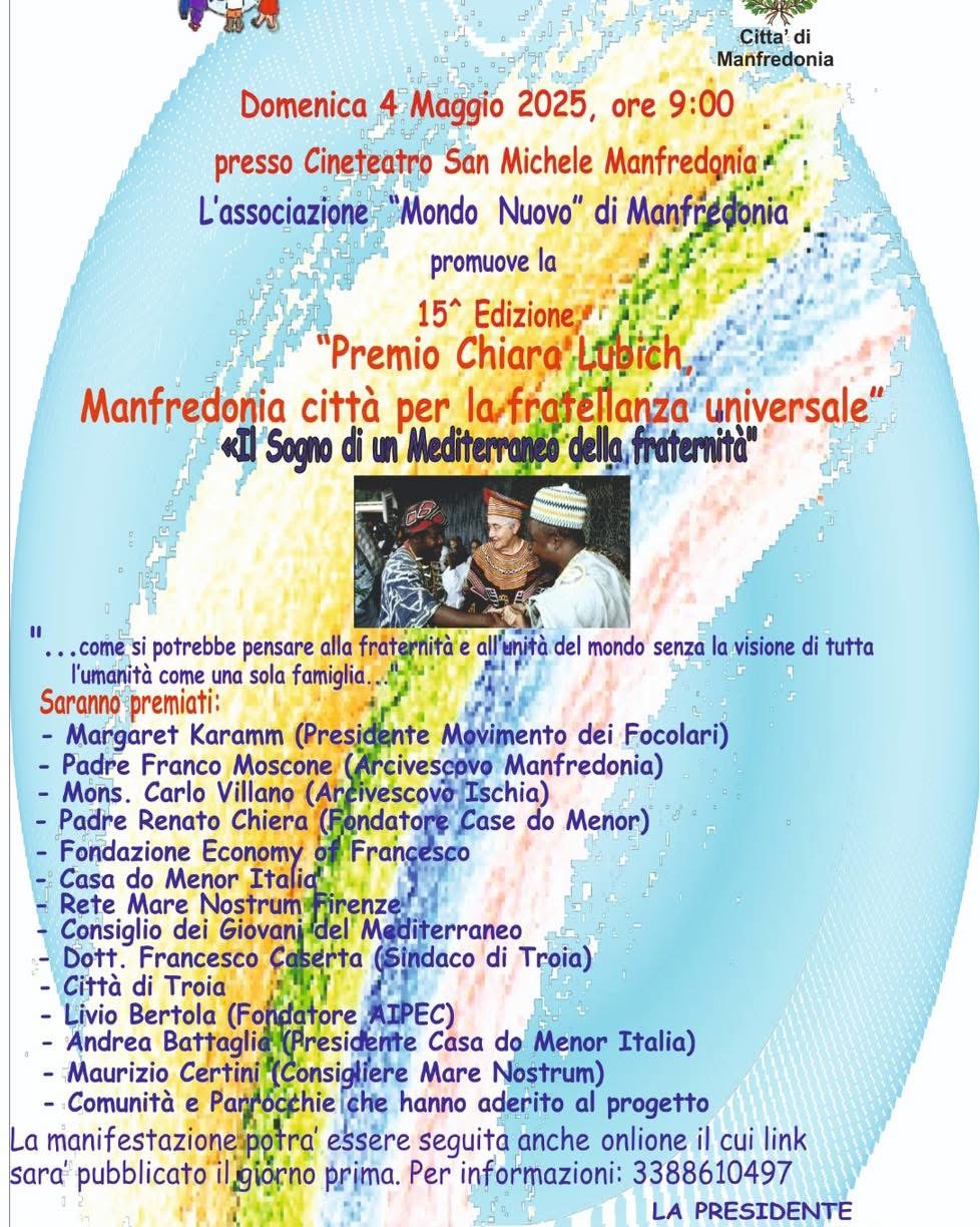 In occasione della XV edizione del Premio “Chiara Lubich – Manfredonia Città per la Fratellanza Universale”, sarà conferito un riconoscimento a padre Franco Moscone, Arcivescovo di Manfredonia–Vieste–San Giovanni Rotondo, per l’impegno costante, personale e comunitario, nella realizzazione dell’iniziativa internazionale “Il sogno di un Mediterraneo della Fraternità”.