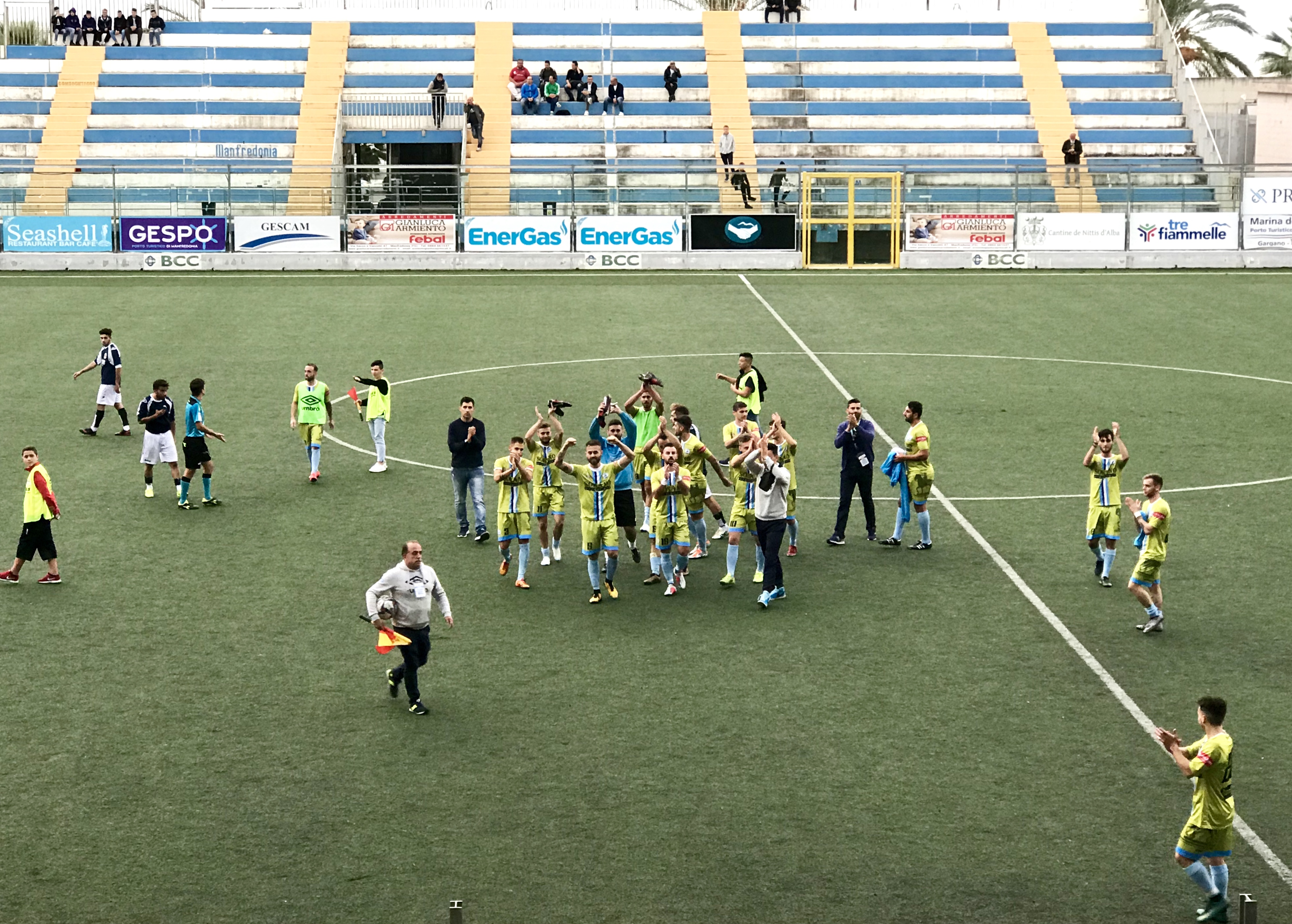 Seconda vittoria interna consecutiva dei blues, che approfittano del doppio turno interno per fare bottino pieno e proseguire la marcia verso la salvezza, posizionandosi alle soglie della cima della graduatoria del girone A. Tre punti meritati, giunti al termine di una partita maschia ma estremamente corretta, giocata col solito piglio ed intraprendenza dal Manfredonia FC di Renis, il quale ha dovuto rinuncia agli infortunati Matteo Lauriola e De Filippo lanciando dal 1’ Spagnuolo, aumentando la fisicità ed i centimetri in mediana.