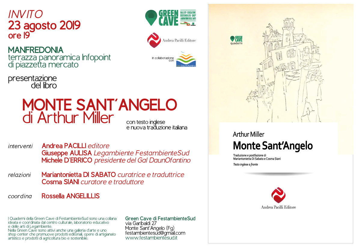 Con la presentazione a Manfredonia, in programma venerdì 23 agosto alle ore 19, continua il tour del racconto “Monte Sant’Angelo” di Arthur Miller, primo dei Quaderni della Green Cave di FestambienteSud pubblicato da Andrea Pacilli Editore. L’evento si terrà sulla terrazza panoramica dell’Infopoint di piazzetta mercato, con la gentile concessione dello spazio da parte del Gal DaunOfantino. Interverranno Mariantoniatta Di Sabato e Cosma Siani, curatori del libro, l’editore Andrea Pacilli, Giuseppe Aulisa di Legambiente FestambienteSud, il presidente del Gal Michele D’Errico e Rossella Angelillis come coordinatrice. Una pubblicazione importante, in distribuzione presso la Green Cave in via Garibaldi 27 a Monte Sant’Angelo e sarà disponibile nella sede della presentazione, perché ripropone, con testo inglese a fronte e una nuova traduzione, il racconto che il grande drammaturgo americano scrisse dopo la sua visita a Monte Sant’Angelo, sul Gargano, avvenuta nel 1948. Uno scritto avvincente, pregno di contenuti e significati importanti, che fruttò all’autore il premio come miglior racconto degli USA nel 1951, l’anno della pubblicazione sulla prestigiosa rivista Harper’s Magazine.