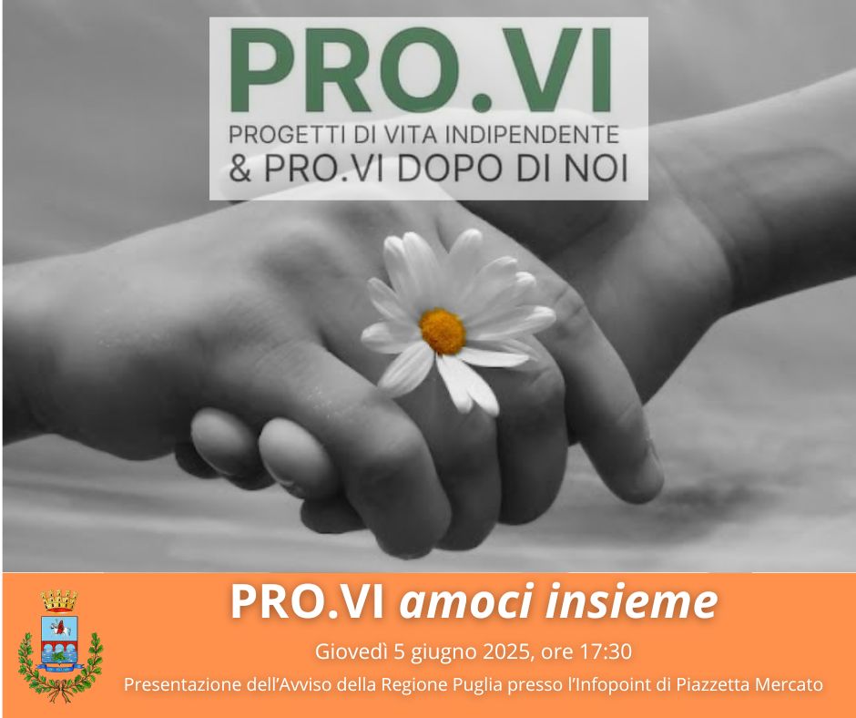 Per garantire supporto a persone con disabilità grave e alle loro famiglie, giovedì 5 giugno 2025, alle ore 17.30, si terrà un incontro pubblico sul bando PRO.V.I. – Progetti di Vita Indipendente, relativo alla nuova finestra 2025. L’appuntamento si svolgerà presso l’Infopoint in piazzetta Mercato, uno spazio scelto per la sua piena accessibilità, privo di scale e barriere architettoniche, per favorire la partecipazione di tutti.