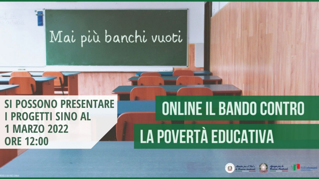 Approvata un’ulteriore assegnazione di 20 milioni di euro per l’Avviso pubblico per la presentazione di proposte di intervento per la selezione di progetti socio-educativi strutturati per combattere la povertà educativa nel Mezzogiorno a sostegno del Terzo Settore da finanziare nell’ambito del PNRR, Missione 5 – Componente 3 – Investimento 3 “Interventi socio-educativi strutturati per combattere la povertà educativa nel Mezzogiorno a sostegno del Terzo Settore” – finanziato dall’Unione Europea–NextGenerationEU.
