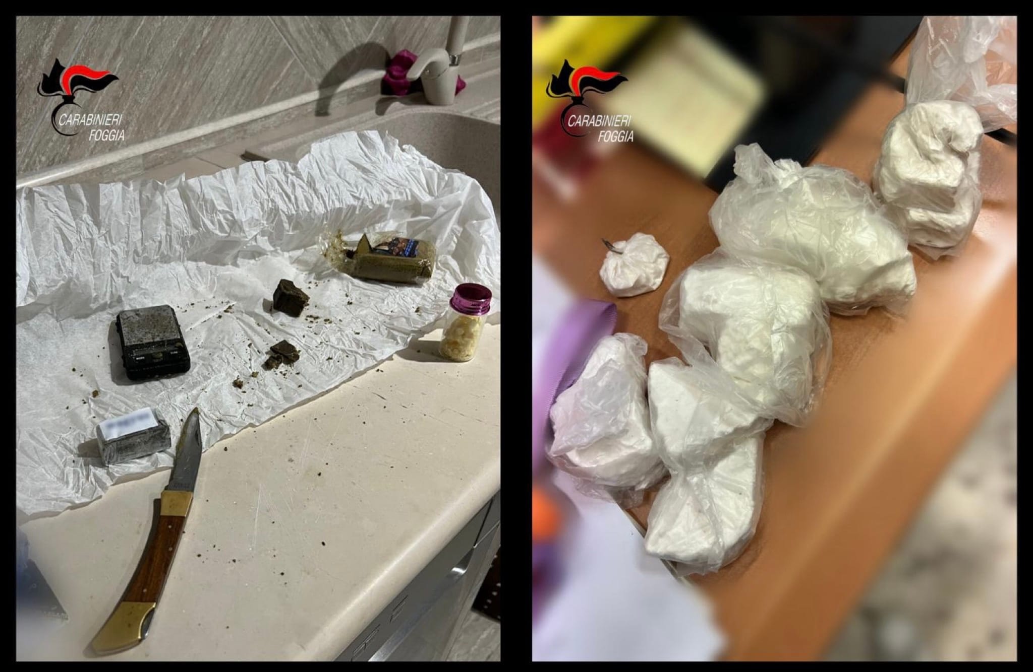 Nello specifico i Carabinieri della Compagnia di San Severo, coadiuvati dal personale della Compagnia d’Intervento Operativo dell’11° Reggimento Carabinieri “Puglia”, hanno tratto in arresto in flagranza di reato un uomo e una donna – accusati di detenzione ai fini di spaccio di sostanze stupefacenti -, sequestrando complessivamente poco meno di 1 kg tra cocaina e hashish. I Carabinieri avrebbero individuato due distinte attività di vendita al dettaglio di droga che i due indagati, appartenenti a nuclei familiari differenti, avrebbero avviato nelle loro rispettive abitazioni. Durante le operazioni di perquisizione a cui i due sono stati sottoposti, i militari dell’Arma hanno rinvenuto all’interno del garage e sul balcone di uno dei due domicili, nella disponibilità della donna, diverse dosi di cocaina e hashish già confezionate e pronte per essere vendute – occultate all’interno di zainetti e pochette – nonché bilancini, materiale per il taglio e il confezionamento dello stupefacente, appunti manoscritti e denaro contante considerato provento di spaccio. In un’altra abitazione nella disponibilità dell’uomo sono stati trovati panetti di hashish e tutto l’occorrente per il confezionamento dello stupefacente.
