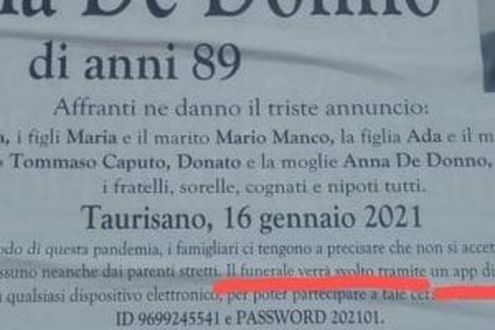 Sul manifesto funebre fatto affiggere per le vie del paese, e pubblicato sul sito dell’agenzia di pompe funebri, i familiari dell’anziano scomparso hanno fornito le istruzioni per partecipare al funerale via web con tanto di id e password precisando che non si accettano visite a casa da parte di nessuno, parenti stretti compresi.