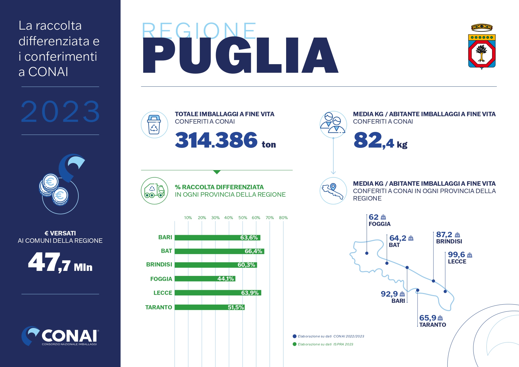Medaglia di bronzo nella differenziata alla provincia di Bari: la sua raccolta differenziata complessiva arriva quasi al 63,6%. Il pro-capite di rifiuti di imballaggio che arriva a CONAI dai cittadini della provincia è di quasi 93 chilogrammi. n