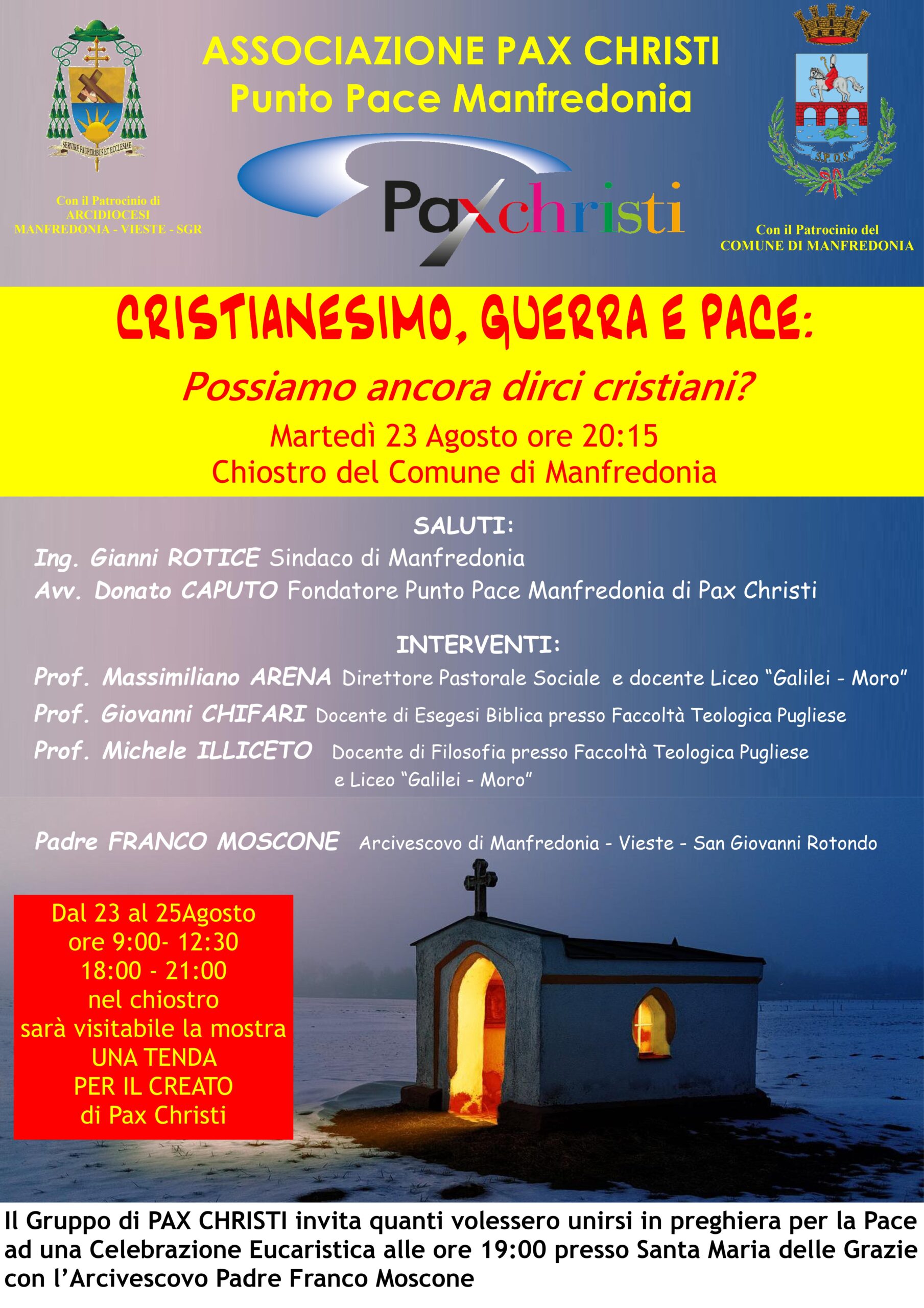 Dopo tale funzione, alle ore 20:15, seguirà l’apertura nel chiostro comunale della mostra “Una tenda per il creato” che ha già fatto il giro dei vari punti pace in Italia sui disastri ambientali provocati dalla guerra. L’apertura della mostra sarà caratterizzata da un franco dibattito a cura dell’Ufficio Diocesano di Pastorale Sociale con il prof. Giovanni Chifari e il prof. Michele Illiceto rispettivamente docenti di Esegesi Biblica e Filosofia presso la Facoltà Teologica Pugliese. Il tema scelto sarà “CRISTIANESIMO E VIOLENZA: possiamo ancora dirci cristiani?” con riflessioni particolarmente necessarie nelle tristi condizioni in cui versano le rappresentanze istituzionali e la nostra società ipocritamente rappresentata rispetto ai suoi valori religiosi e costituzionali.