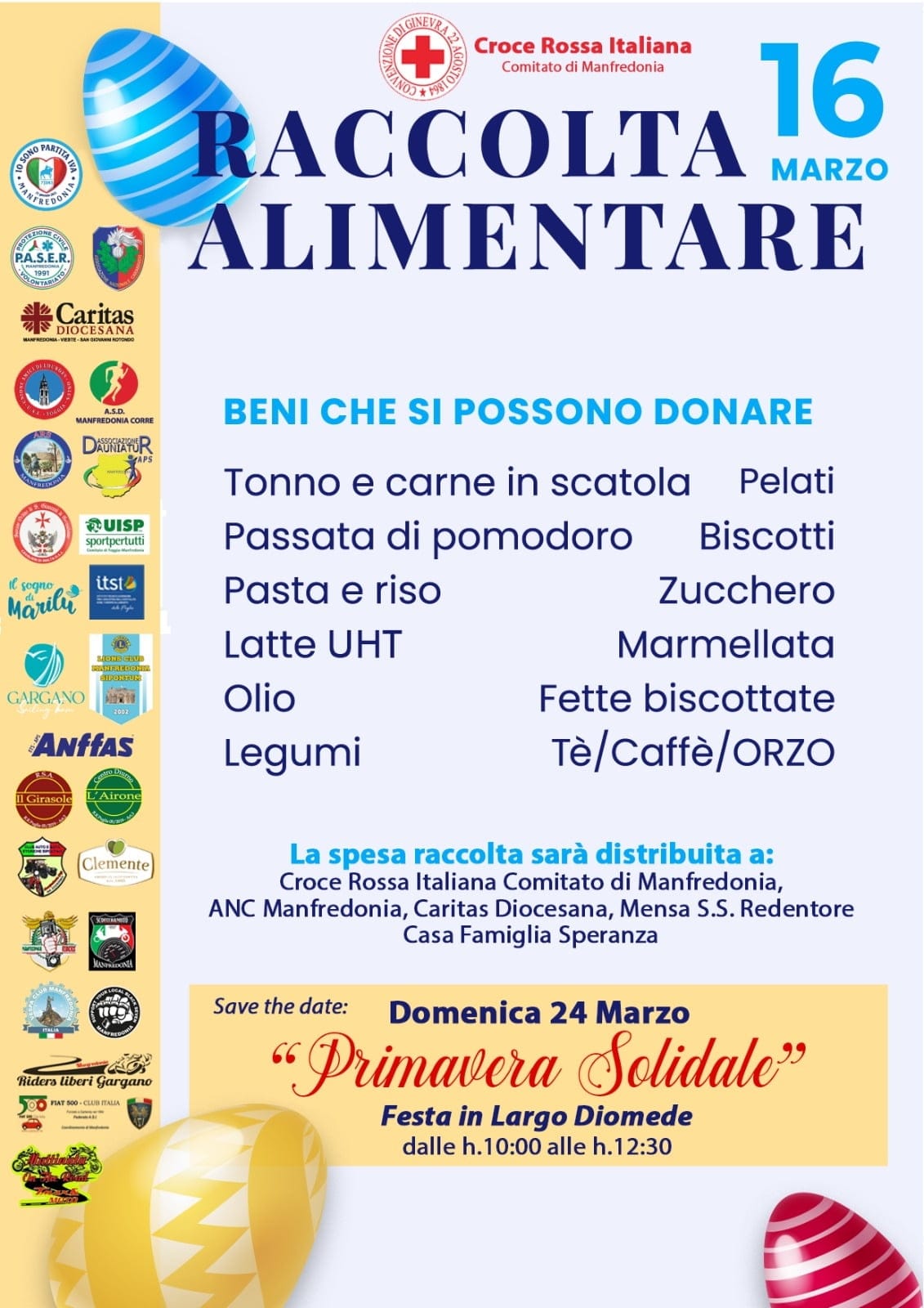 Croce Rossa Italiana – Comitato di Manfredonia – in collaborazione con una lunga lista di Associazioni di Volontariato, motoristiche ed automobilistiche del territorio –annuncia una raccolta alimentare, presso i negozi di generi alimentari, markets e super markets, ed una giornata-evento in largo Diomede.