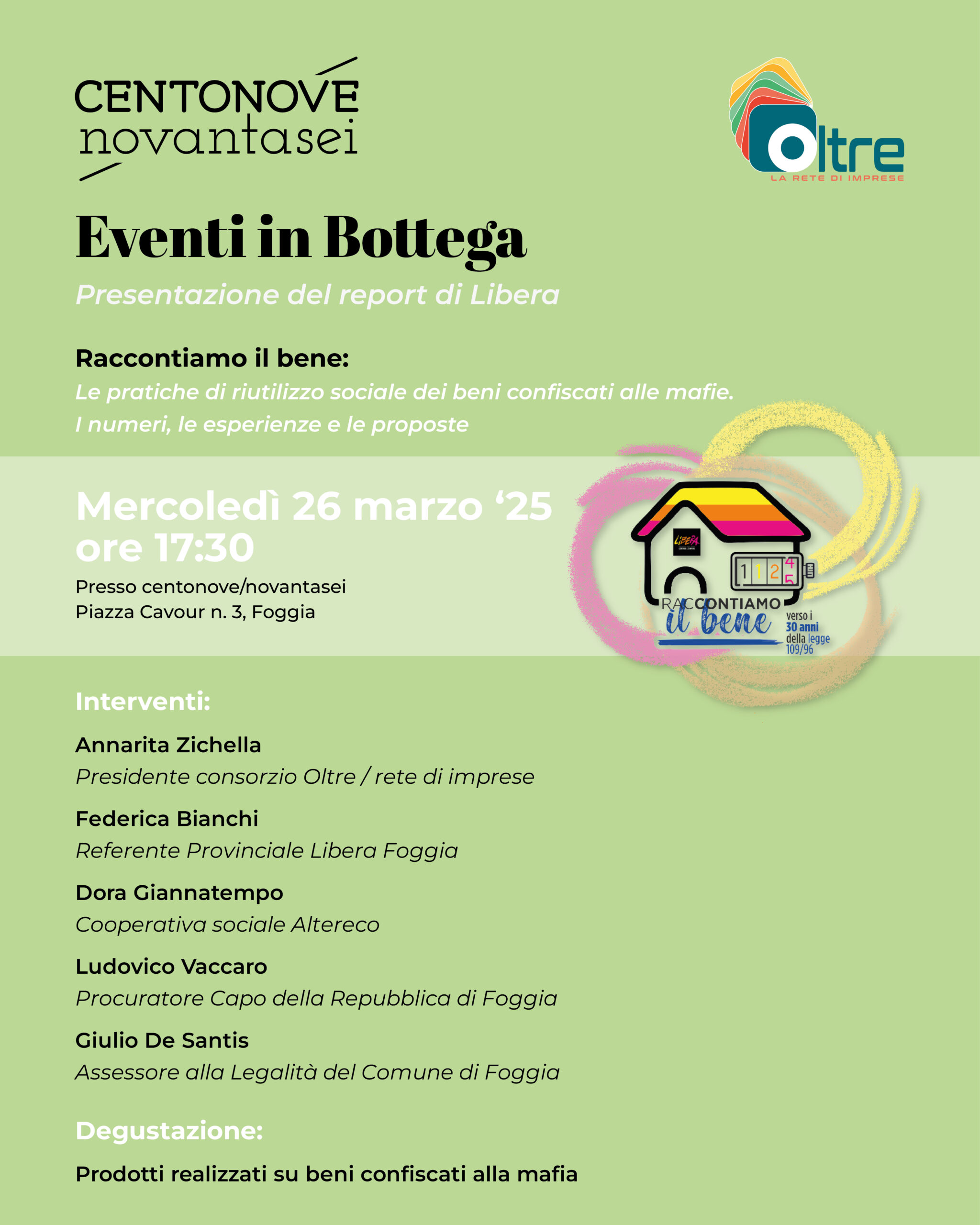 Sarà presentata a Foggia, mercoledì 26 marzo 2025, alle ore 17.30, negli spazi della bottega centonove/novantasei la nuova edizione del report “Raccontiamo il bene – Le pratiche di riutilizzo sociale dei beni confiscati alle mafie. I numeri, le esperienze e le proposte”, il dossier a cura di Libera. Associazione, nomi e numeri contro le mafie che racconta quella parte di Italia in cui opera una comunità alternativa a quella mafiosa, che lavora e si impegna a realizzare un nuovo modello di sviluppo territoriale. L’iniziativa è promossa dal consorzio di cooperative sociali Oltre / rete di imprese che da due anni in piazza Cavour n. 3 porta avanti il sogno della bottega centonove/novantasei, che sin dal nome vuole raccontare l’importanza e l’efficacia della legge 109/96, la normativa che consente la restituzione alla collettività delle ricchezze e dei patrimoni sottratti alle organizzazioni criminali favorendone il riutilizzo pubblico e sociale.