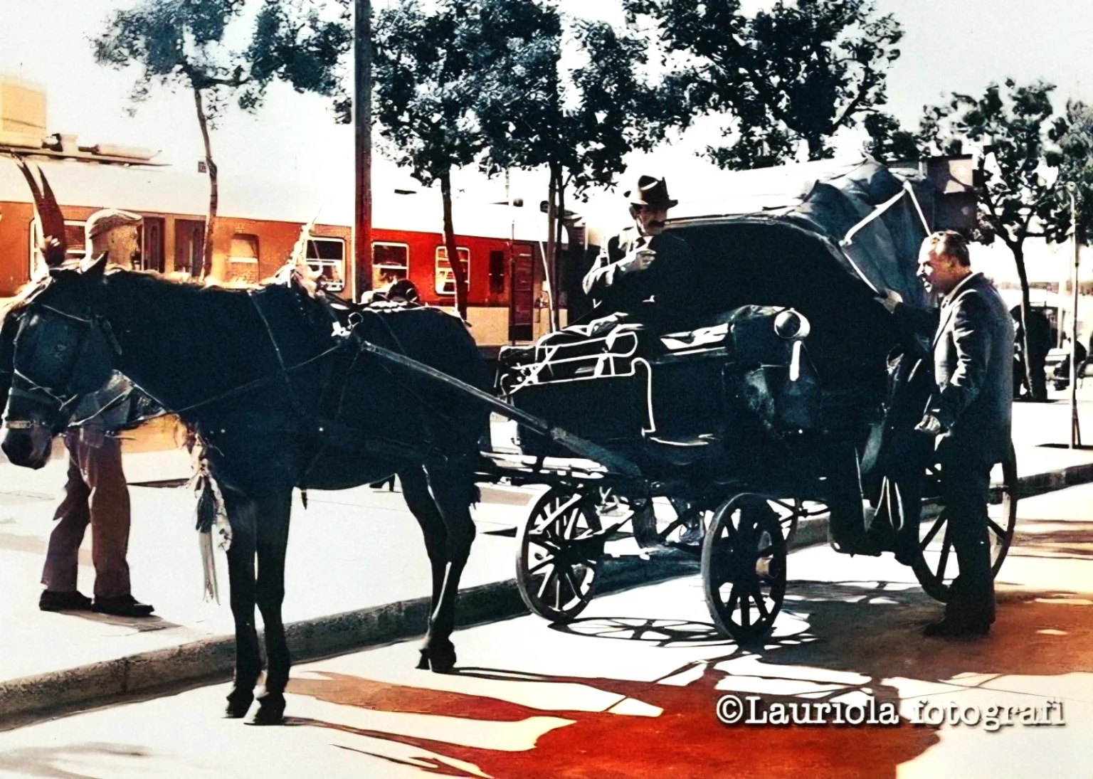 Gemil, portava una bombetta nera in testa,un paio di baffoni scuri tirati un po’ all’insù, un mezzo cappotto che dava sul nero, gilet, pantaloni e stivaletti. Una frusta con un lungo scudiscio molto raffinata,la sua età indefinibile.
