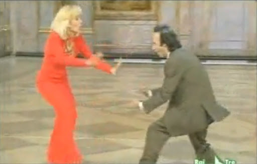 Uno sketch che ha fatto la storia della tv italiana: da un lato, in vestito elegante rosso, Raffaella Carrà, dall’altro, in giacca e camicia spiegazzata, il comico Roberto Benigni. Ospite della trasmissione Fantastico 12 della Rai, il toscano esuberante inizia i quasi dieci minuti di monologo provando ad alzare l’abito della conduttrice. Era il 1991 e Carrà, a cavallo tra il divertimento e l’imbarazzo, prova a gestire l’incontenibile comico, ma finisce per inciampare e cadere sul palco. Benigni, anziché aiutarla, le si butta addosso.
