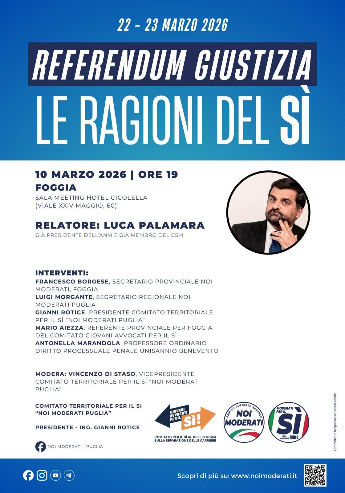 FOGGIA Foggia e pronta ad accogliere un ospite illustre Luca Palamara gia presidente dell Associazione Nazionale Magistrati e gia membro del Consiglio Superiore della Magistratura. Il secondo evento in Capitanata organizzato dal Comitato Territoriale per il Si Noi Moderati Puglia capitanato dall ex sindaco di Manfredonia Gianni Rotice e previsto martedi 10 marzo 2026 alle 19 nella Sala Meeting dell Hotel Cicolella Viale XXIV Maggio 60 e sara intitolato Referendum Giustizia le Ragioni del Si. Saranno approfonditi i temi legati alla riforma del sistema giudiziario in vista della consultazione referendaria del 22 23 marzo.